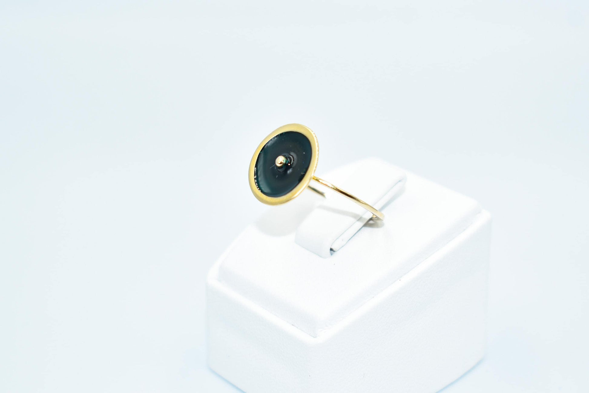 Ένα ιδιαίτερο και κομψό δαχτυλίδι Κ14 με πράσινο σμάλτο και μια διακριτική χρυσή μπίλια στο κέντρο, λεπτομέρεια που του δίνει μοναδικό χαρακτήρα.