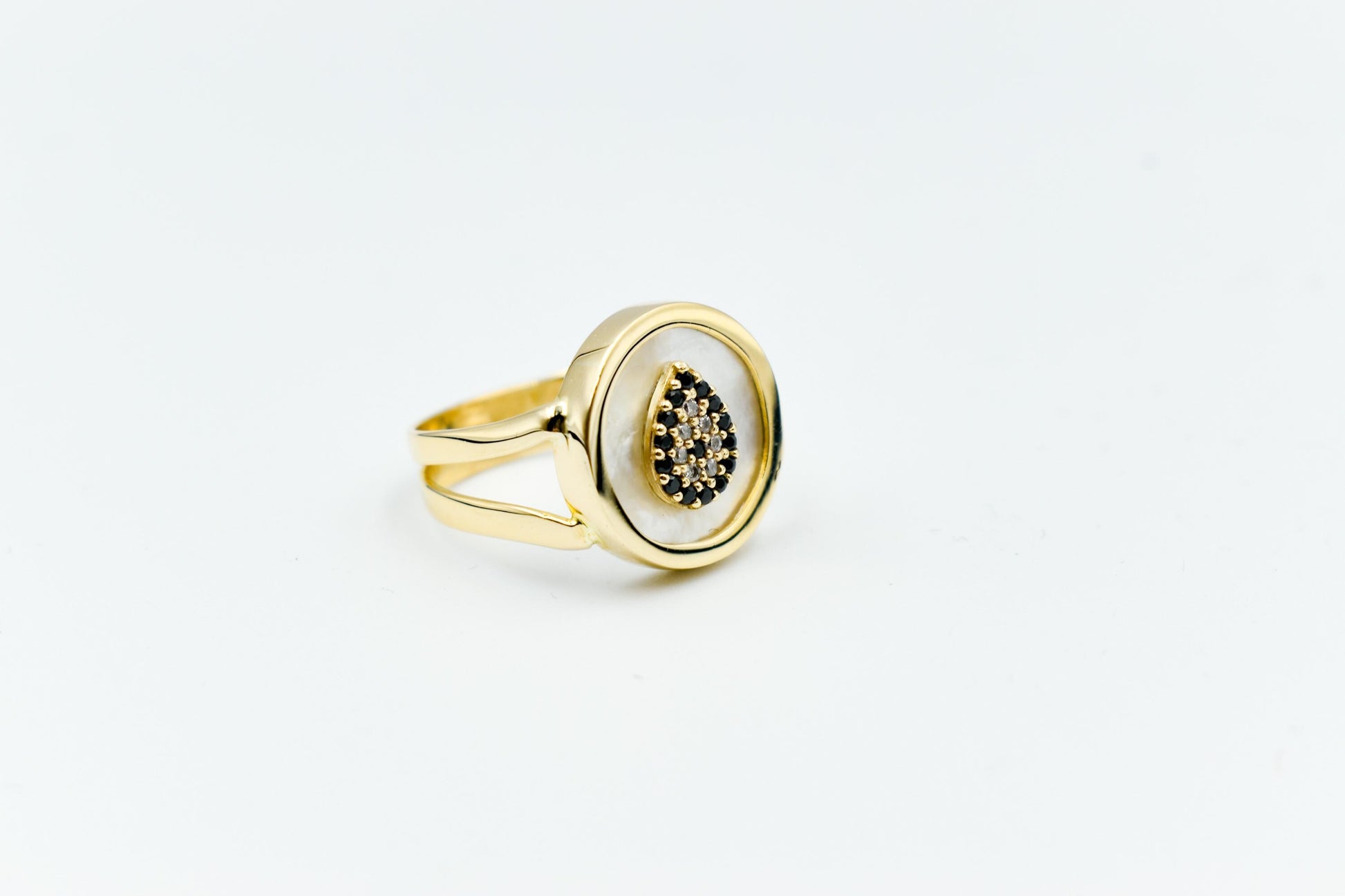 Introducing our stunning drop ring, crafted from 14k gold, a perfect blend of elegance and faith. This beautifully designed piece features a sparkling zircon stone and mother of pearl that adds a touch of brilliance to any outfit. The timeless drop design makes this ring a meaningful accessory, ideal for both casual and formal occasions.