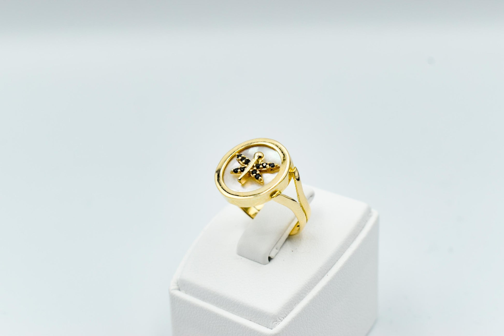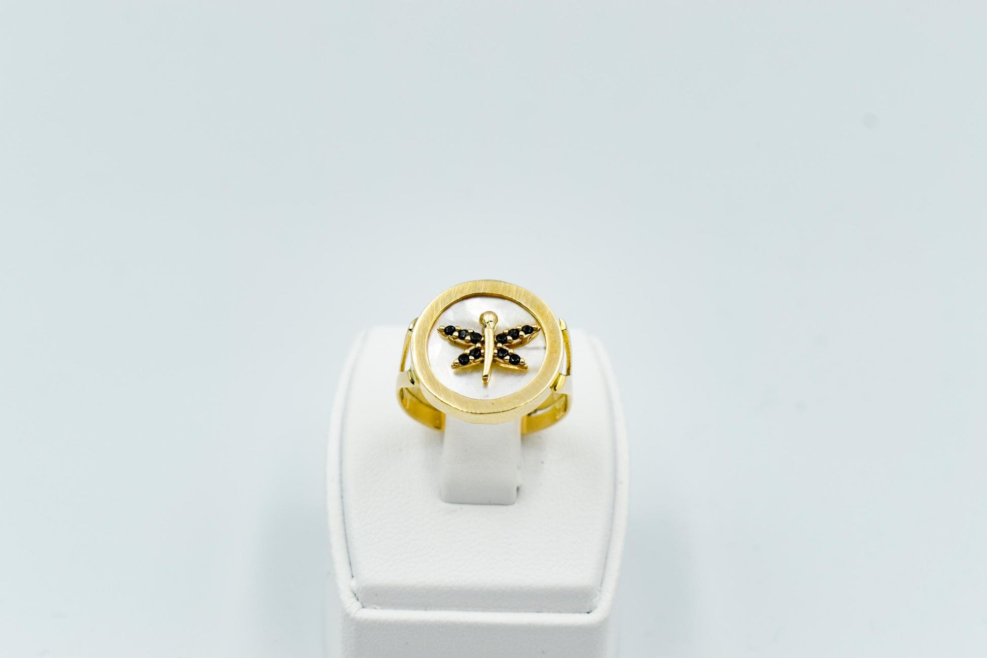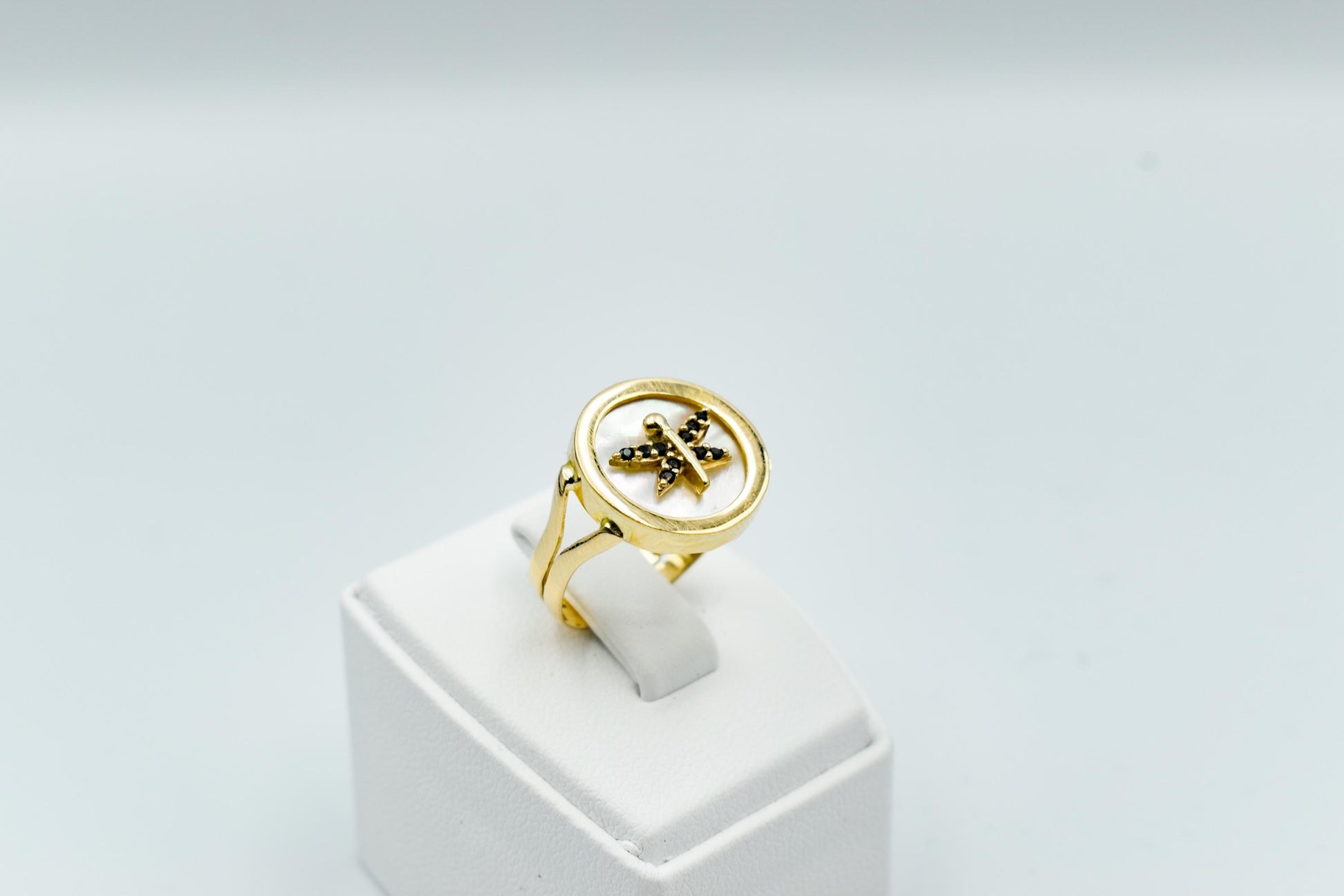 Χειροποίητο δαχτυλίδι Κ14 με στρογγυλό φιλντισένιο δίσκο και χρυσή λιβελούλα στο κέντρο, διακοσμημένη με μαύρα ζιργκόν που χαρίζουν κομψότητα και διακριτική λάμψη.