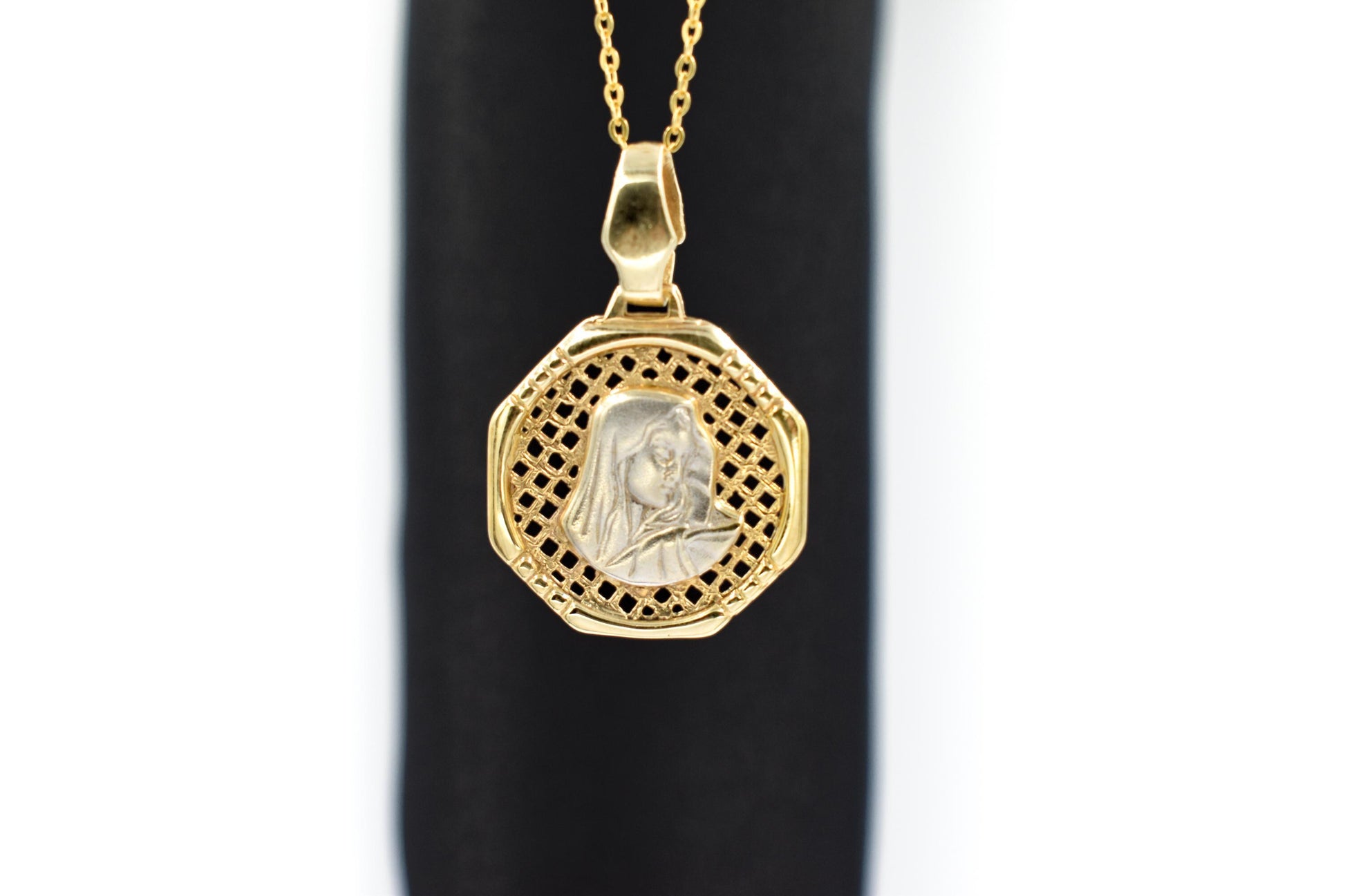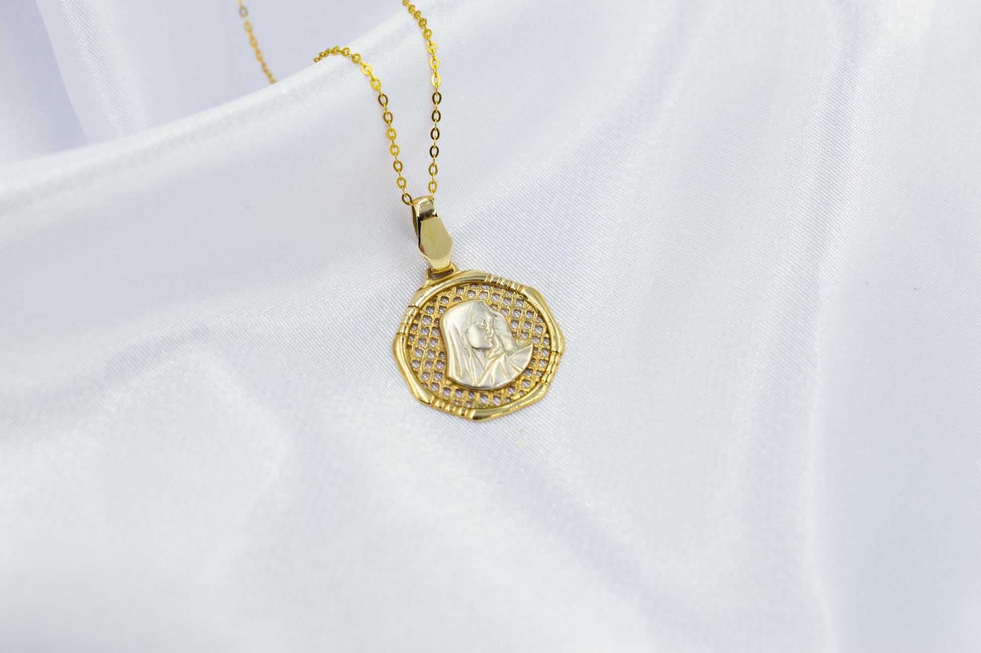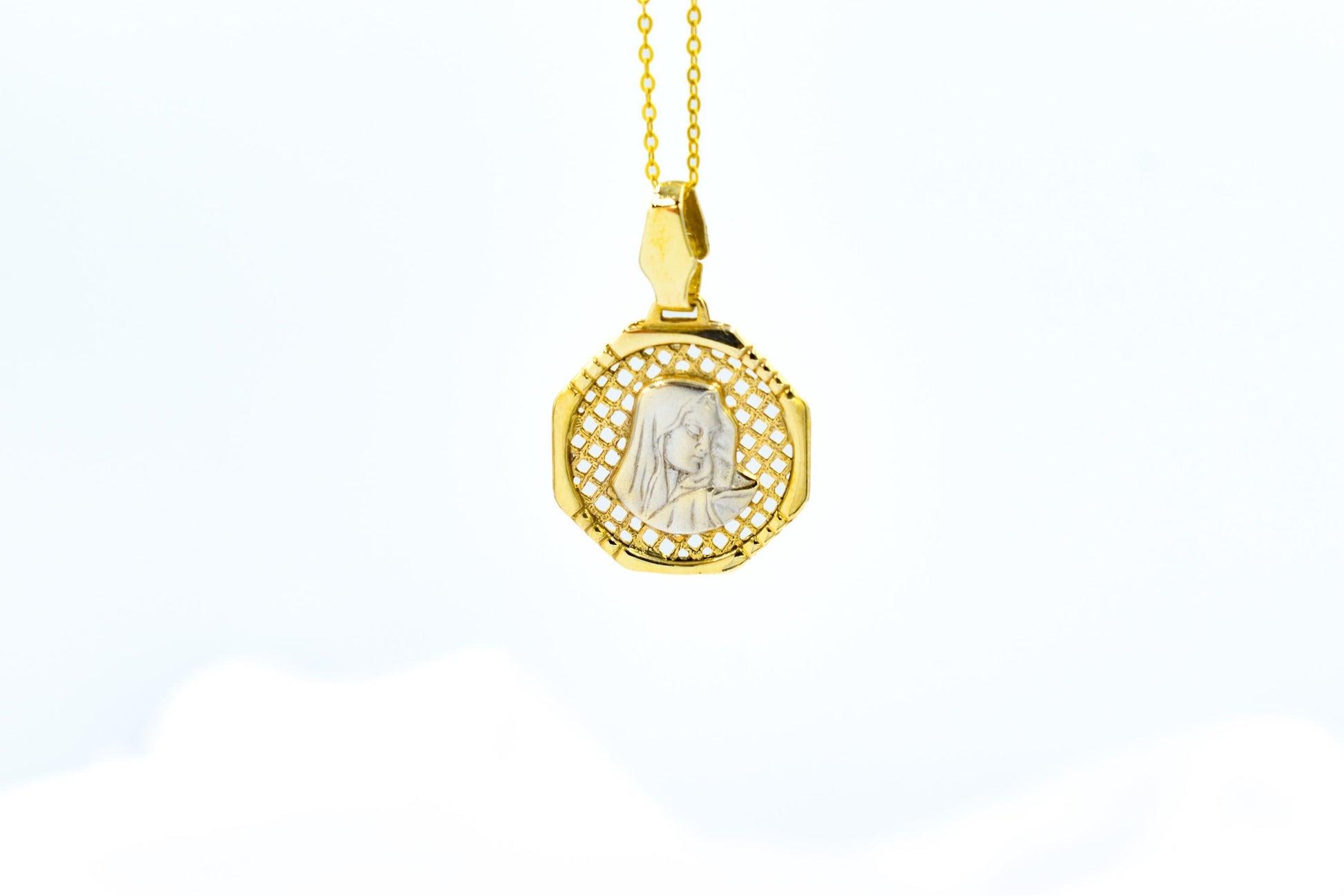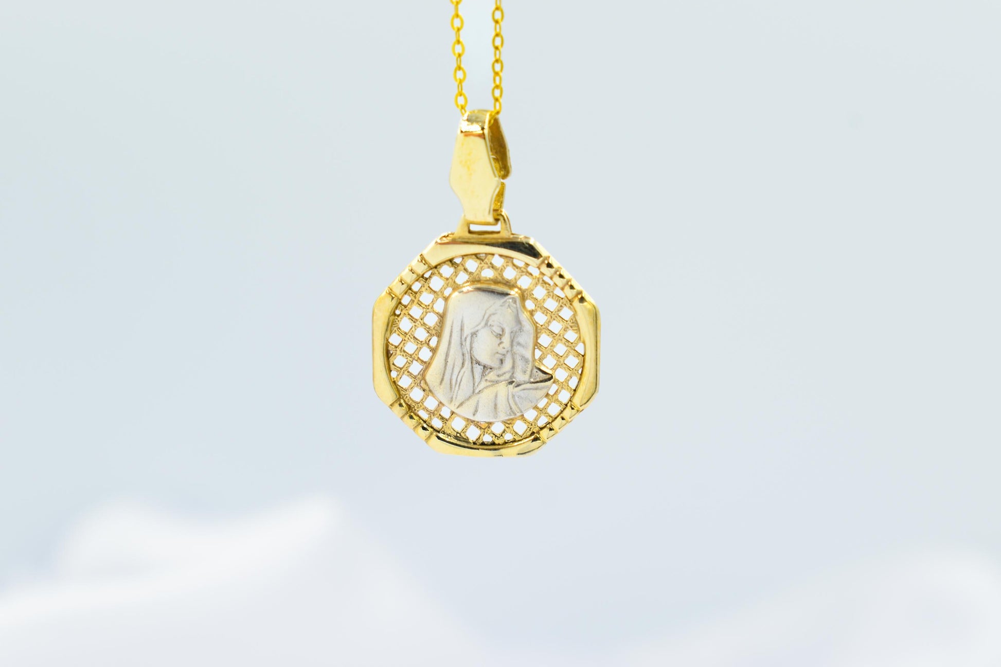 Κομψό κωνσταντινάτο κρεμαστό από χρυσό 14 καρατίων, με λεπτομέρεια Παναγίας σε λευκόχρυσο φινίρισμα και ιδιαίτερο οκτάγωνο διάτρητο πλαίσιο. Ένα διαχρονικό φυλαχτό με μοντέρνα αισθητική, ιδανικό για καθημερινή χρήση αλλά και για δώρο με συμβολισμό. ✨