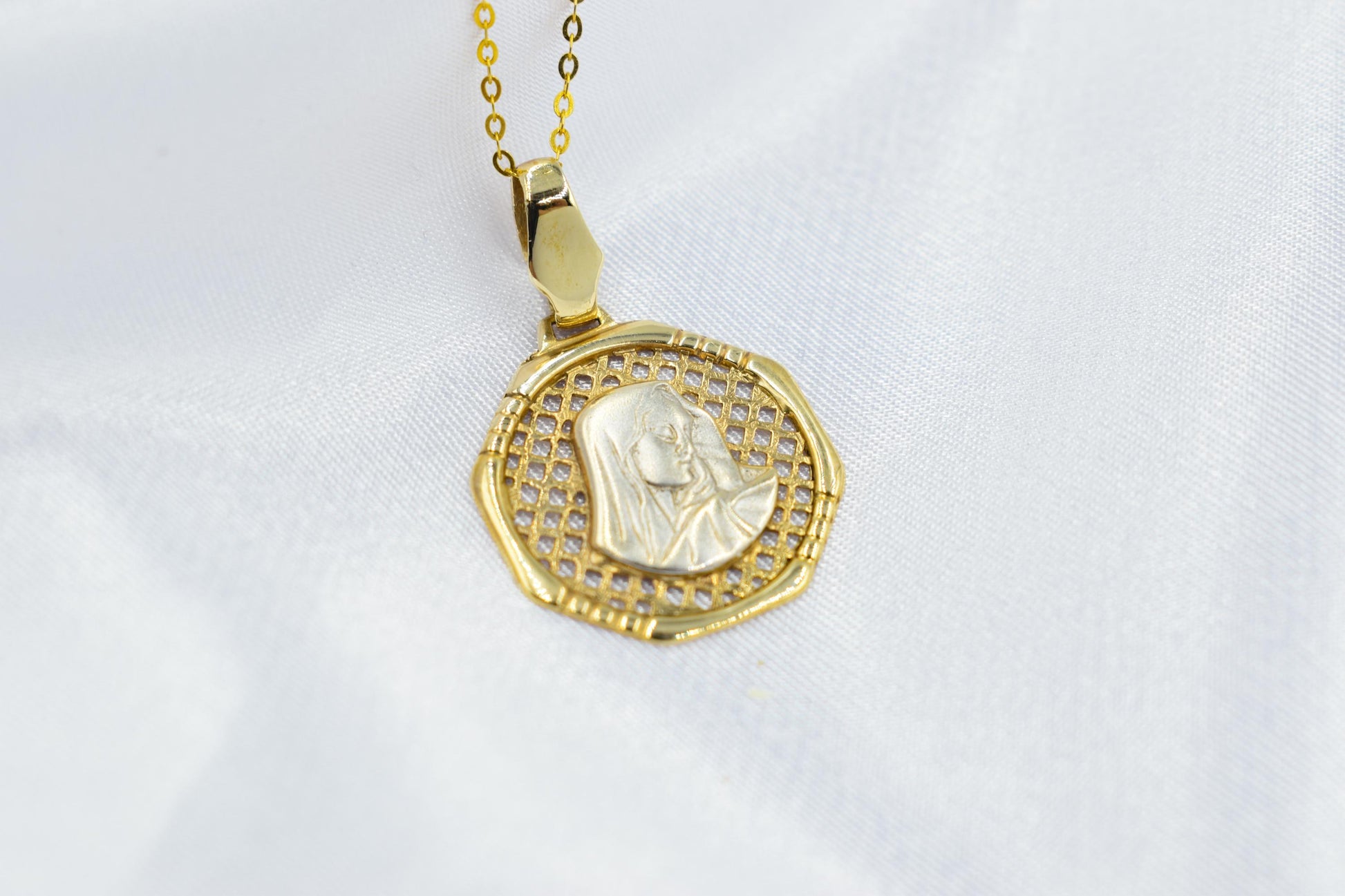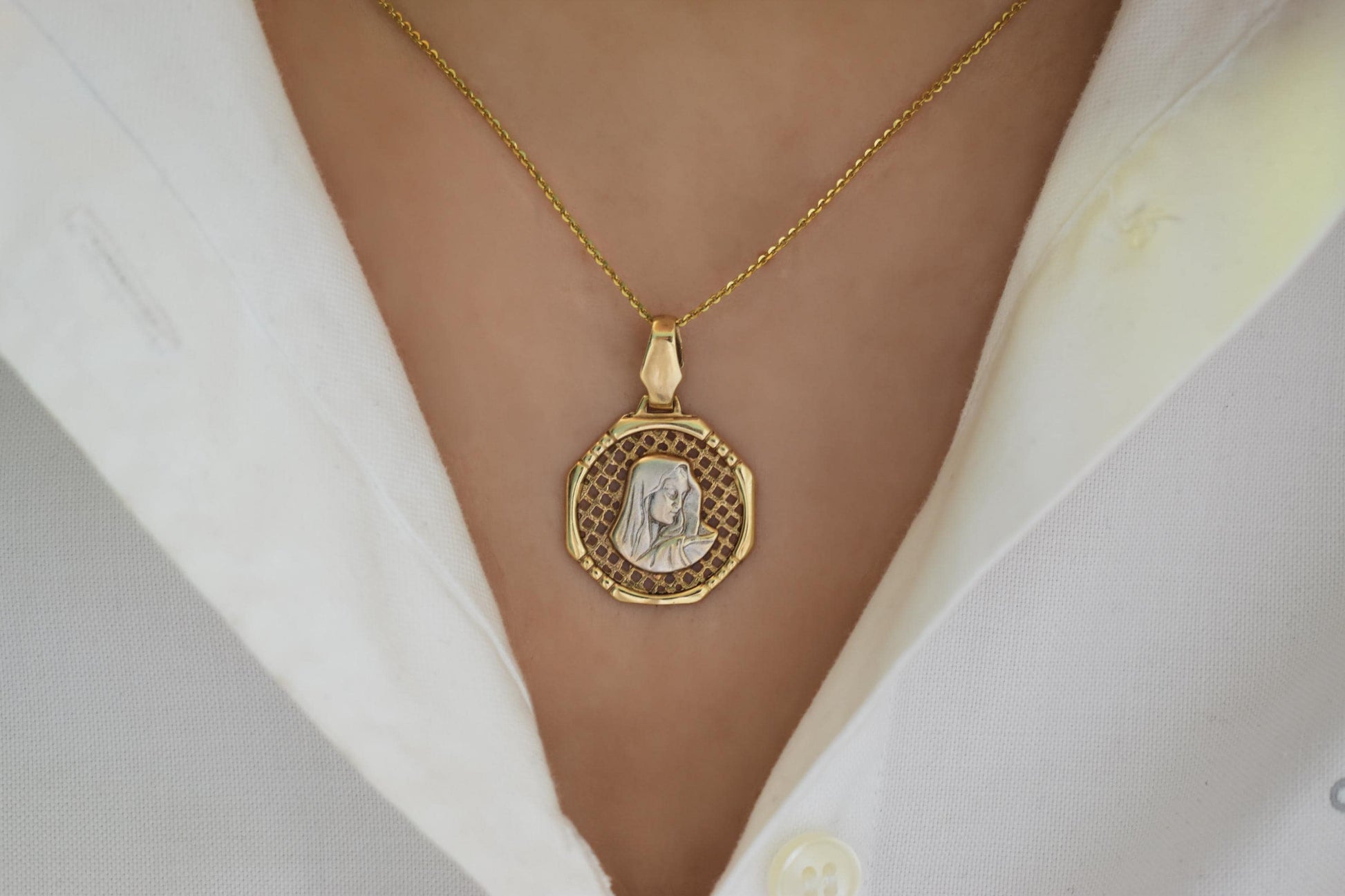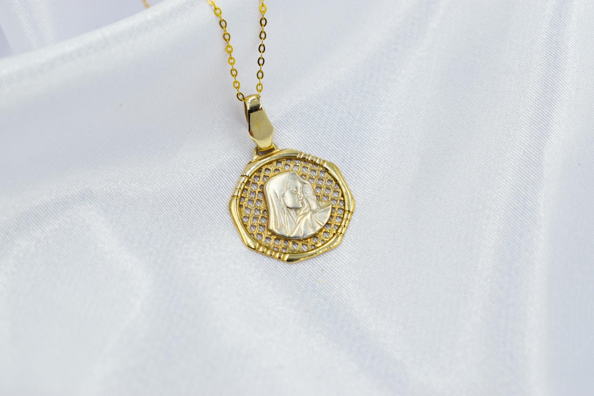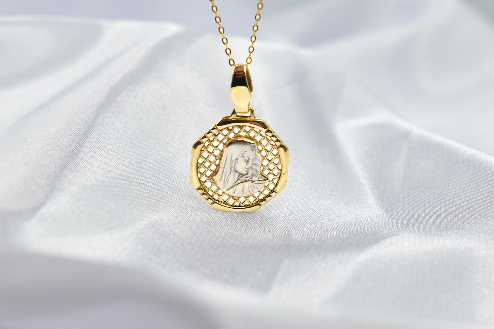 Κομψό κωνσταντινάτο κρεμαστό από χρυσό 14 καρατίων, με λεπτομέρεια Παναγίας σε λευκόχρυσο φινίρισμα και ιδιαίτερο οκτάγωνο διάτρητο πλαίσιο. Ένα διαχρονικό φυλαχτό με μοντέρνα αισθητική, ιδανικό για καθημερινή χρήση αλλά και για δώρο με συμβολισμό. ✨