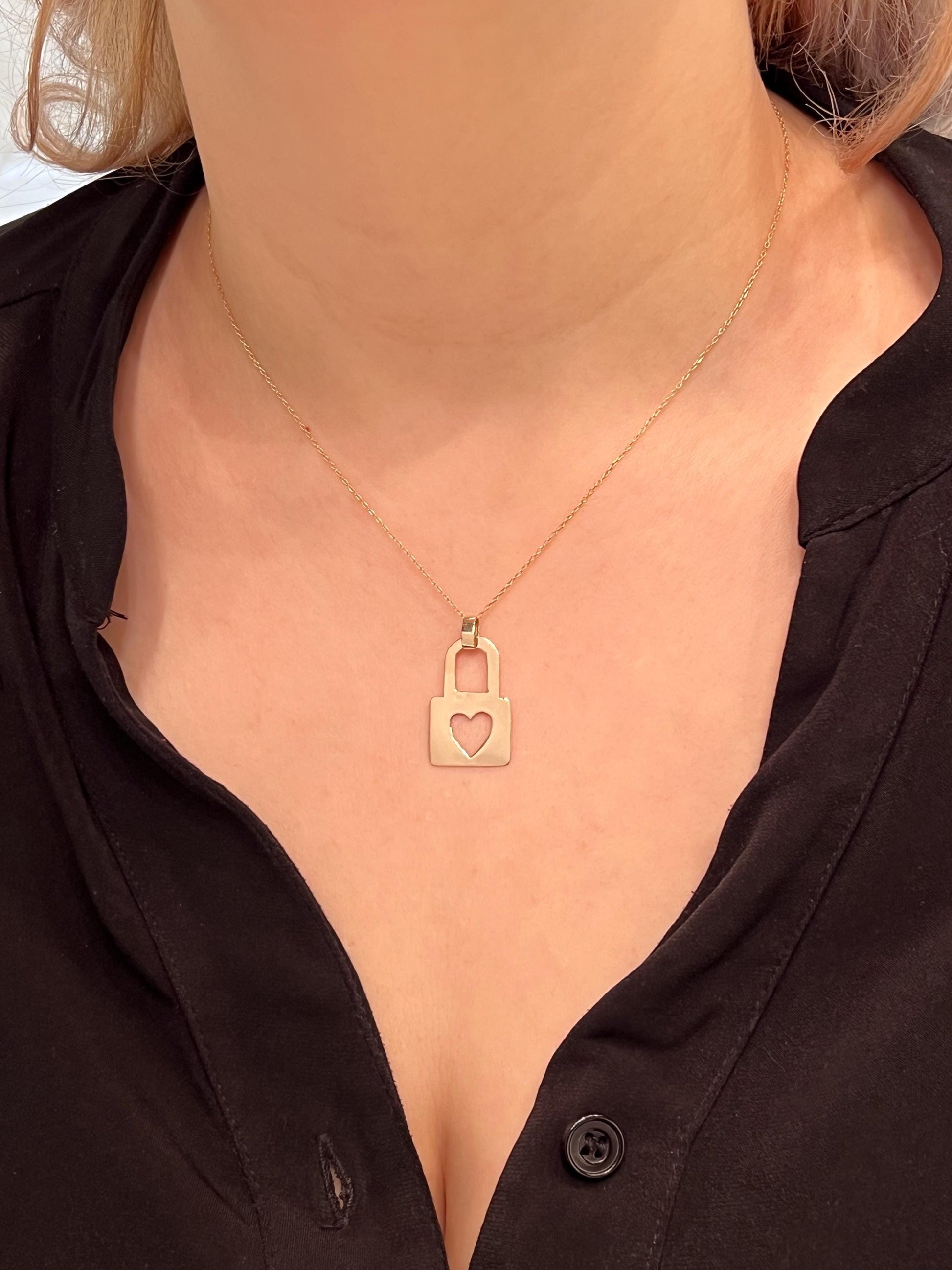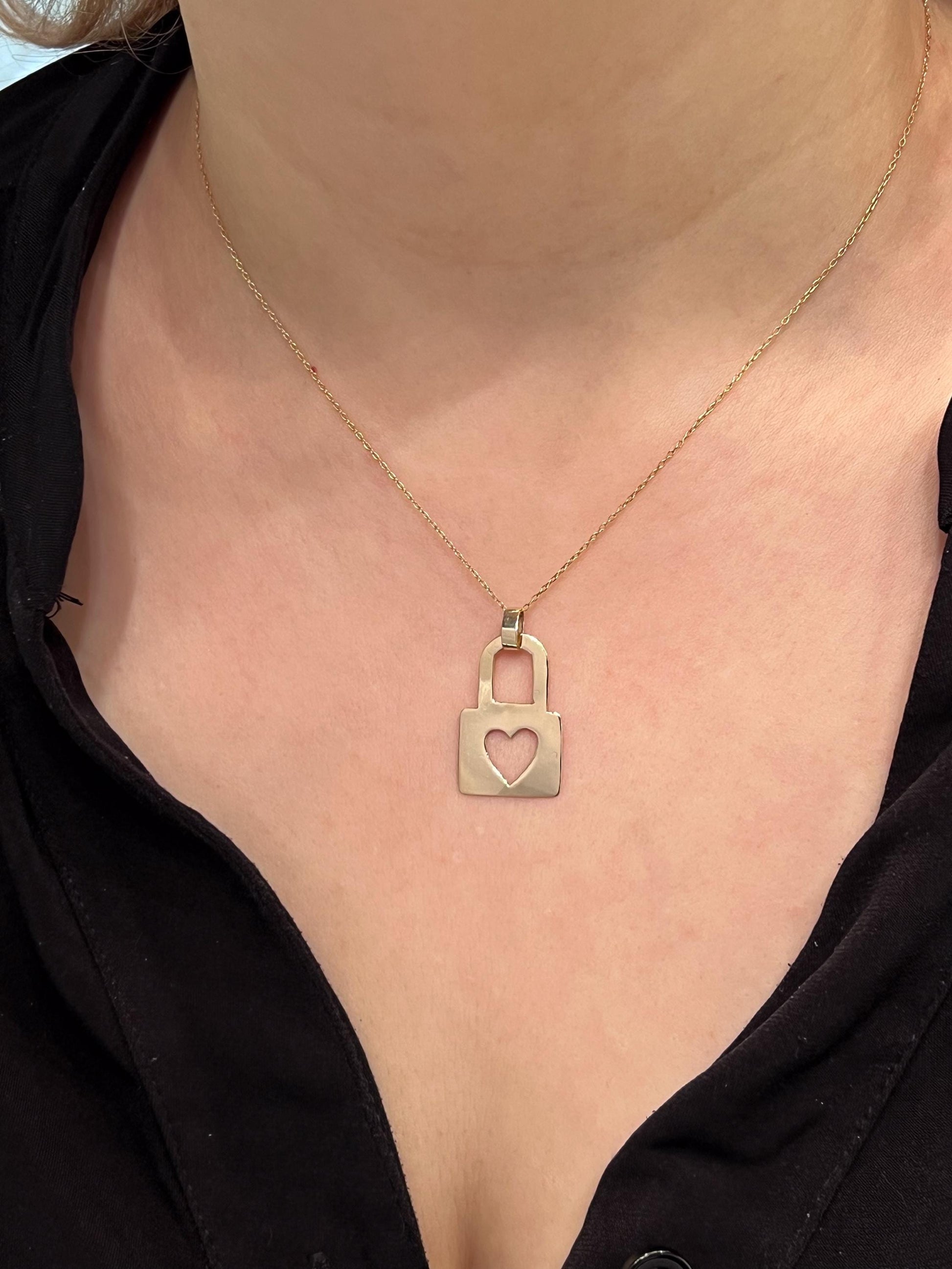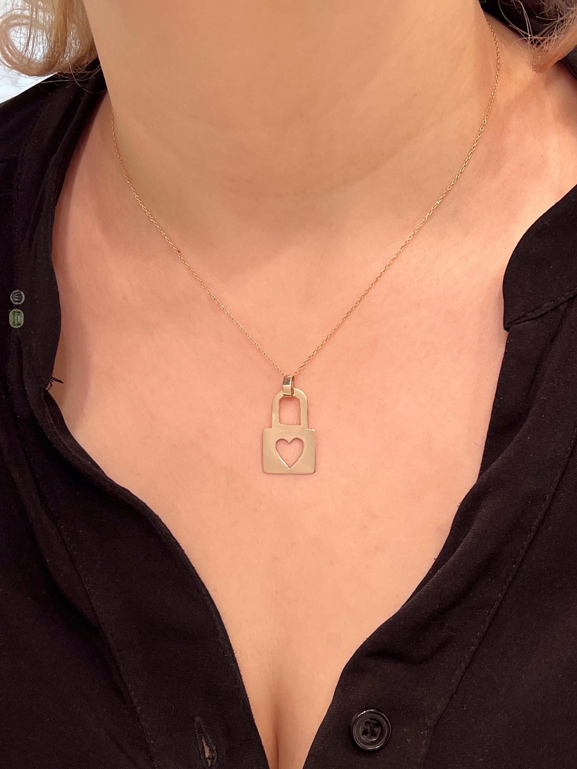 Ρομαντικό και μοντέρνο κρεμαστό σε σχήμα λουκέτου με καρδιά, κατασκευασμένο εξολοκλήρου από χρυσό 14 καρατίων. Το minimal σχέδιο του το κάνει ιδανικό για καθημερινή χρήση αλλά και για layering με άλλα λεπτά κολιέ. ✨