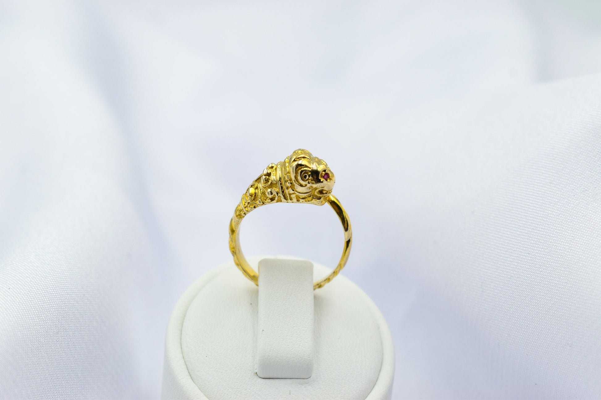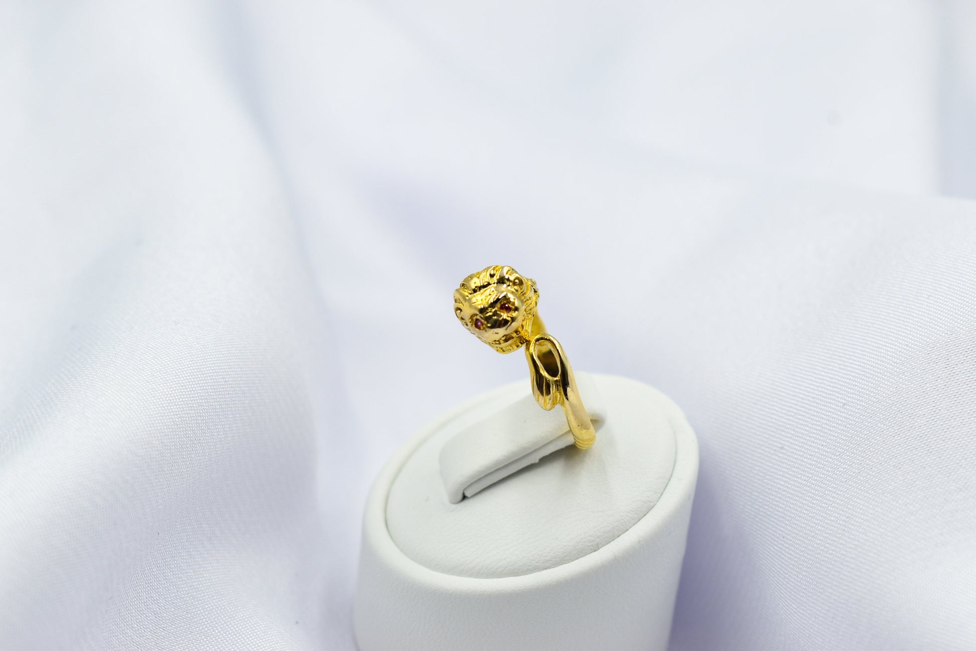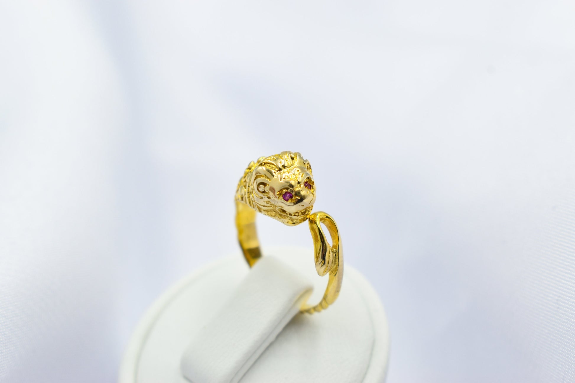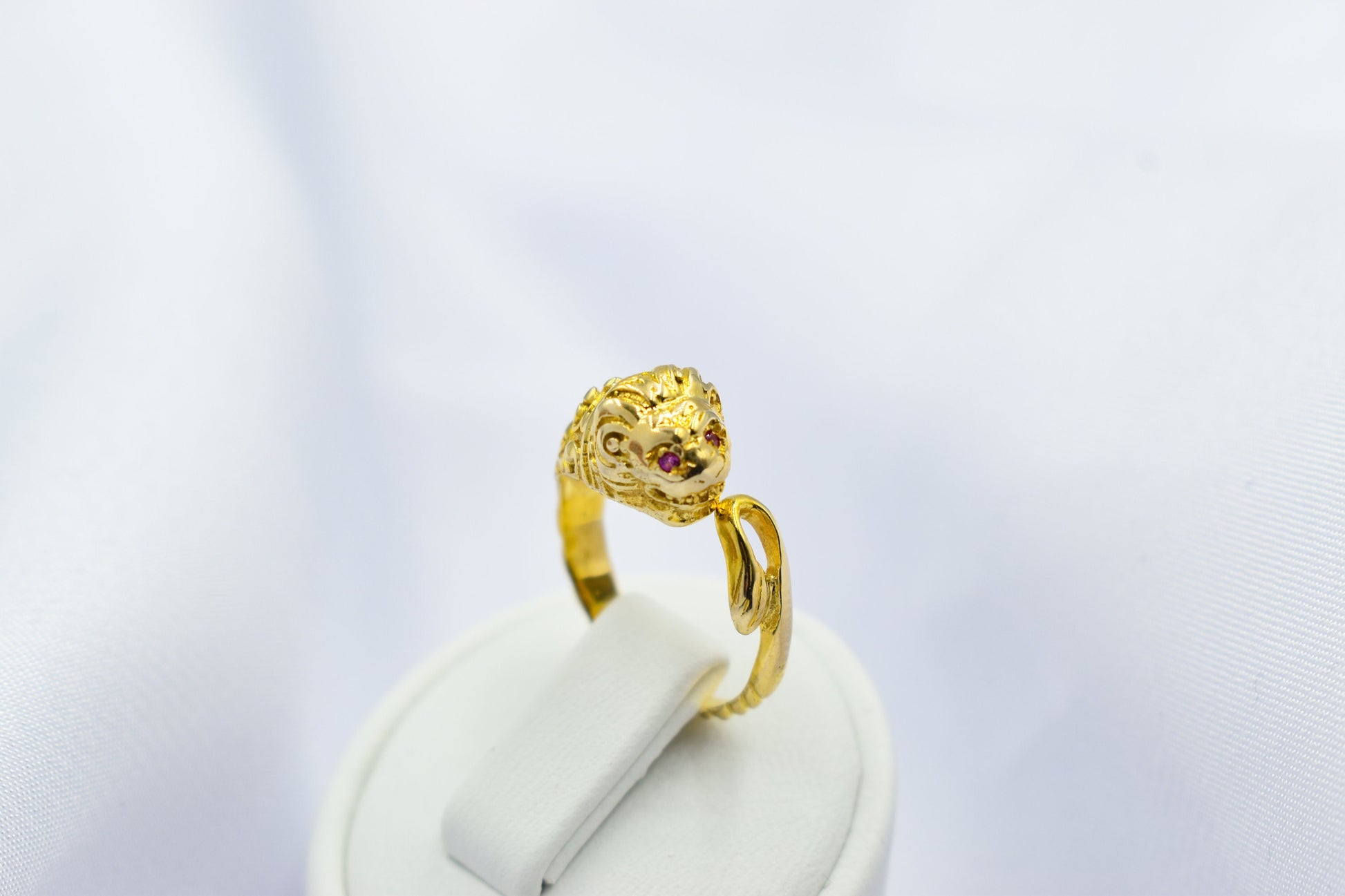 Χειροποίητο δαχτυλίδι Κ14 σε σχέδιο λιονταριού, με εντυπωσιακή τρισδιάστατη λεπτομέρεια και δύο ορυκτά ρουμπίνια στα μάτια.