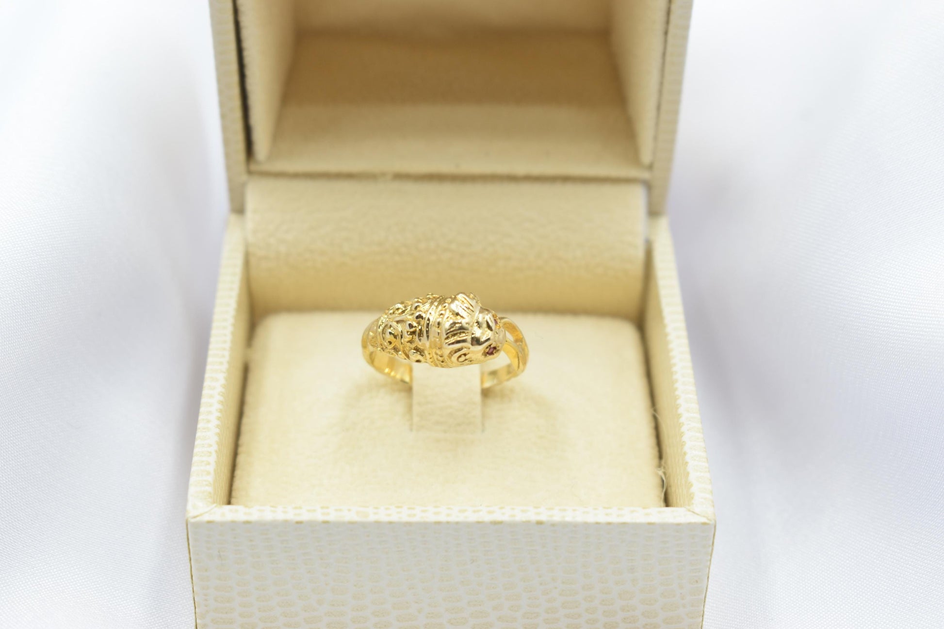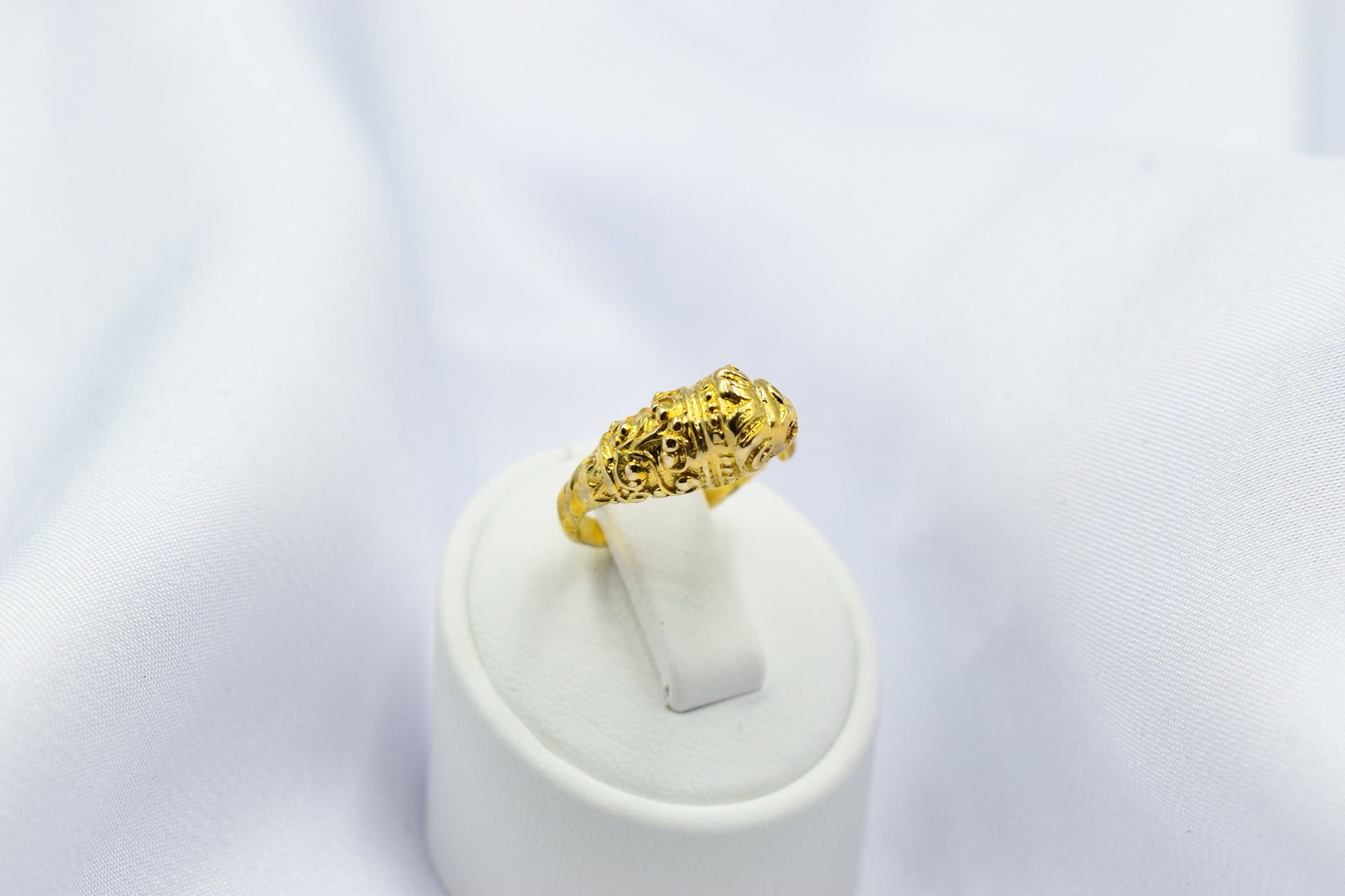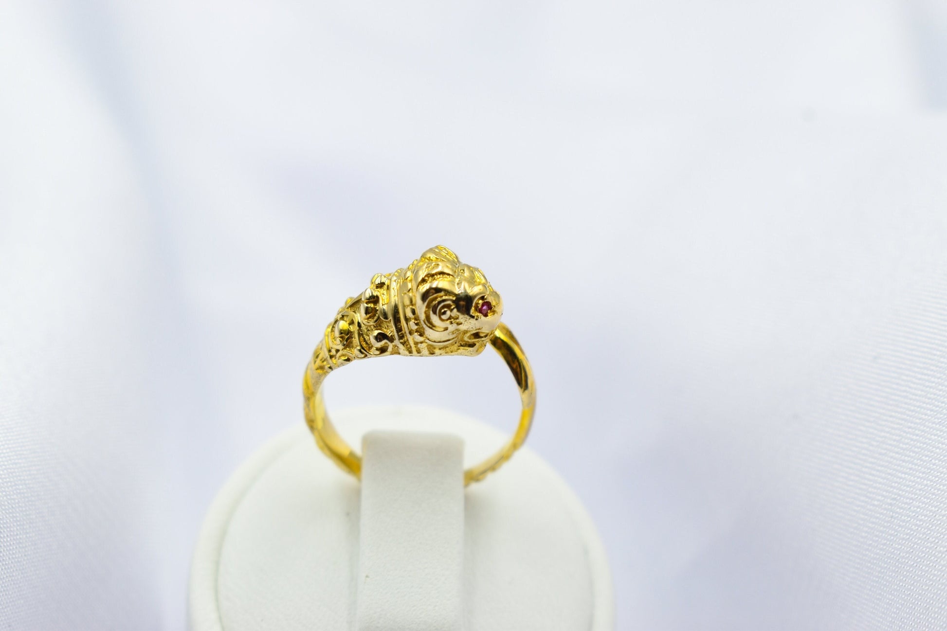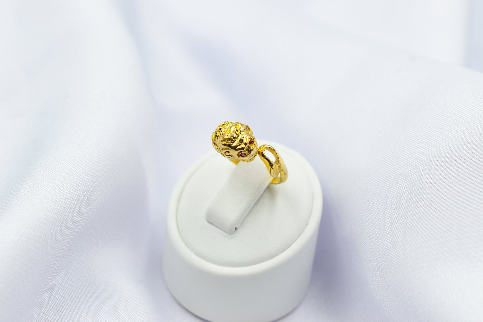 Χειροποίητο δαχτυλίδι Κ14 σε σχέδιο λιονταριού, με εντυπωσιακή τρισδιάστατη λεπτομέρεια και δύο ορυκτά ρουμπίνια στα μάτια.