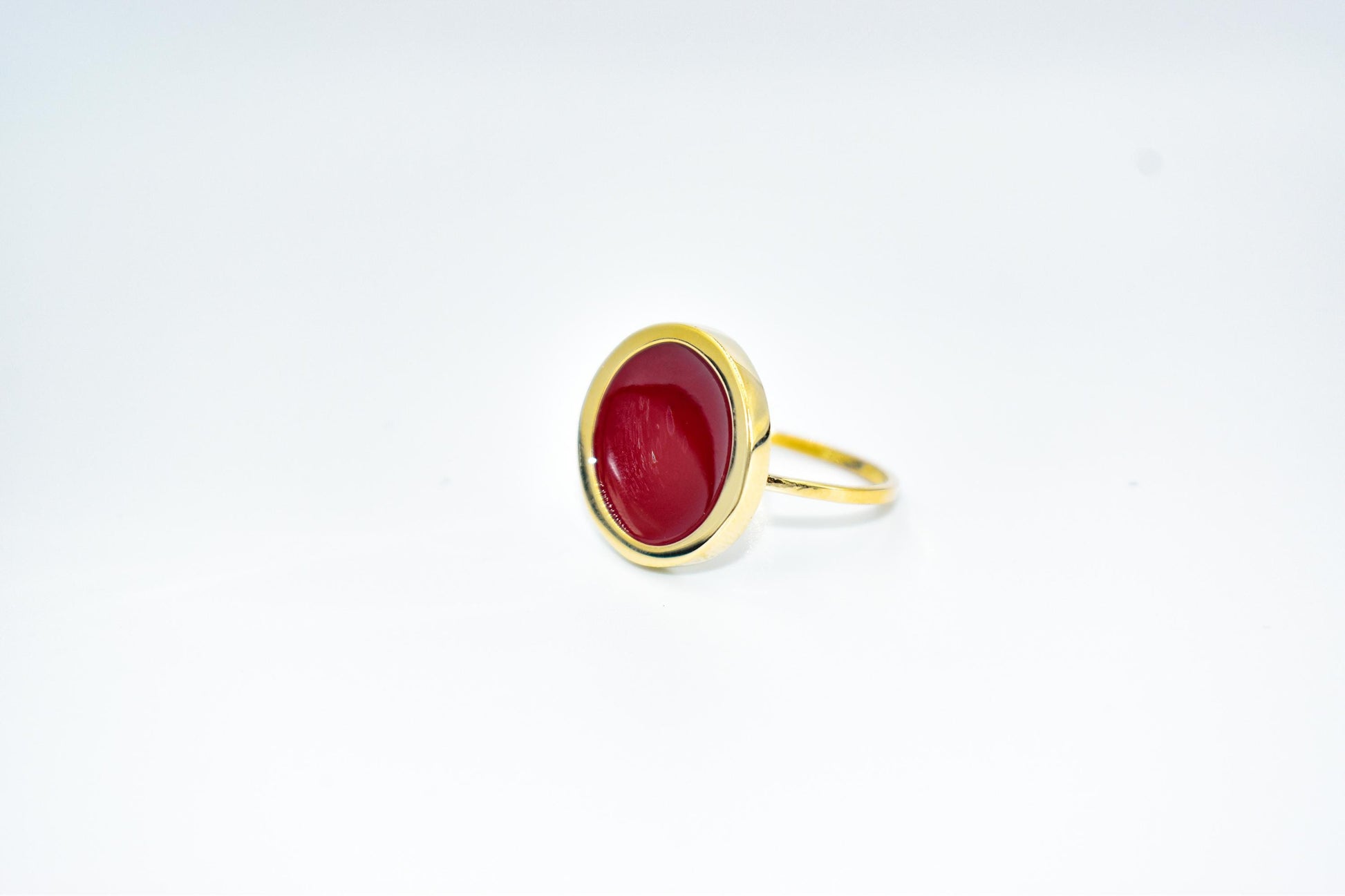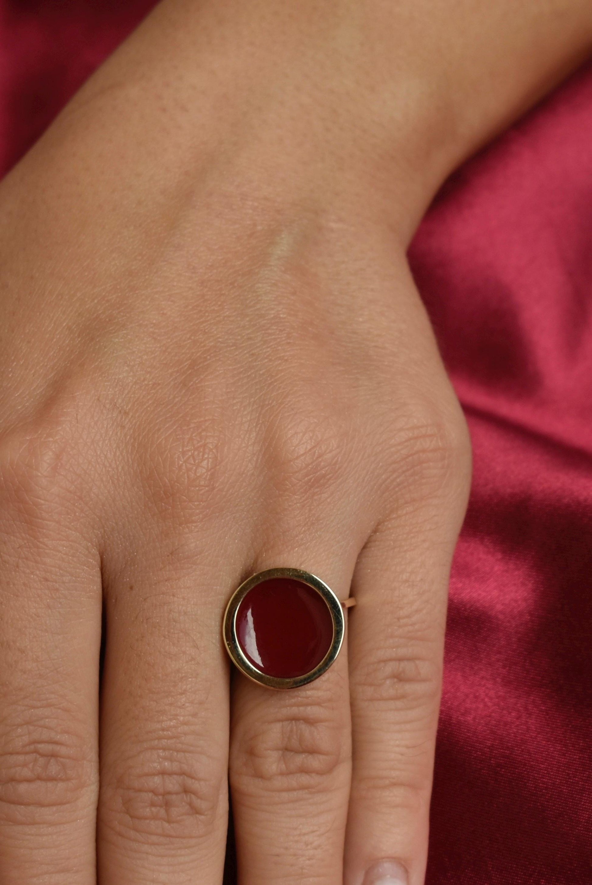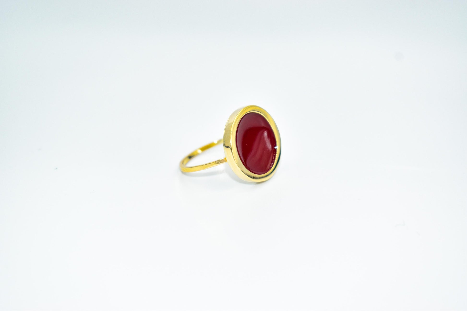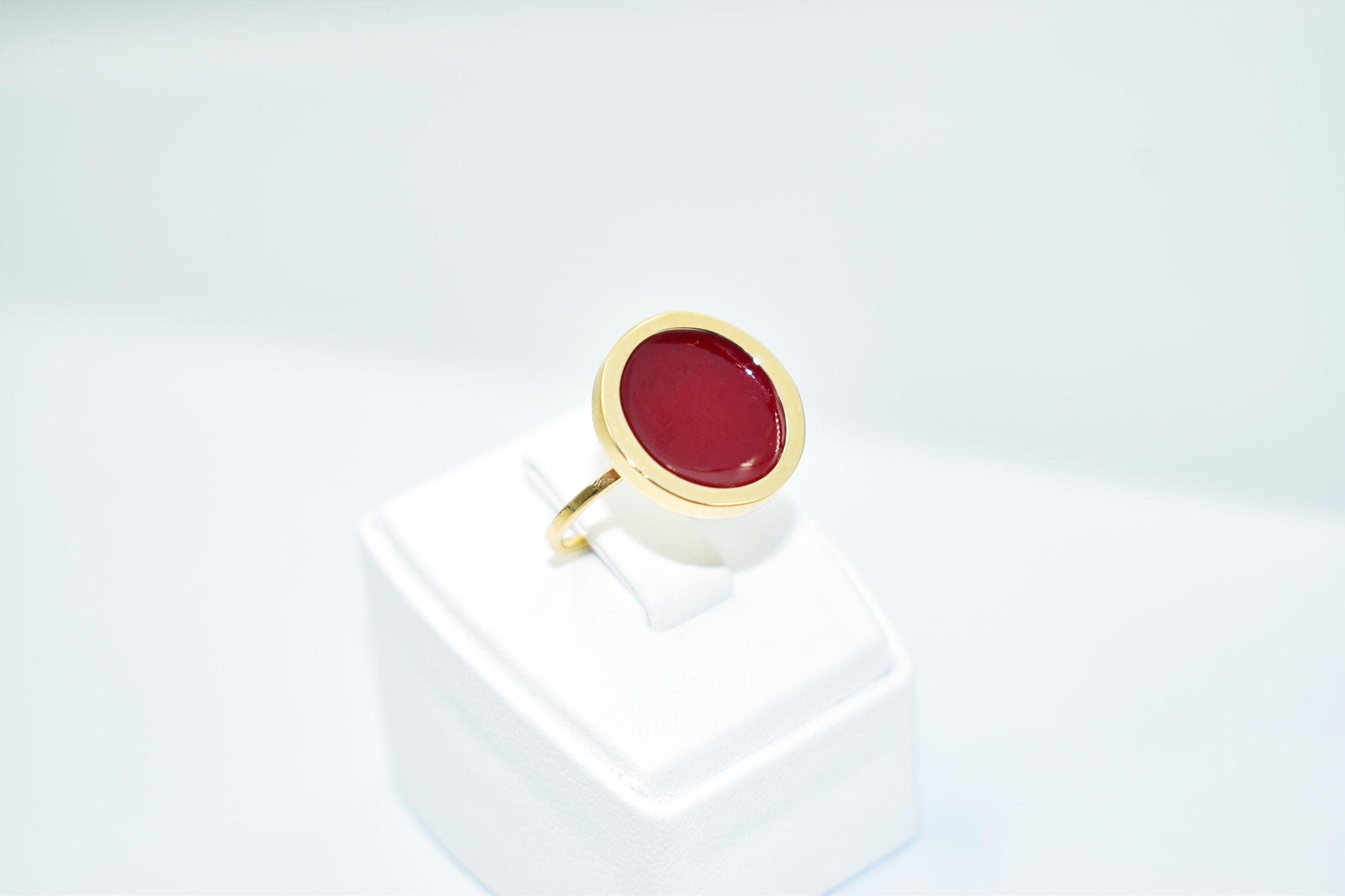 Χρυσό δαχτυλίδι Κ14 με εντυπωσιακό μπορντό σμάλτο σε στρογγυλή καμπυλωτή επιφάνεια.