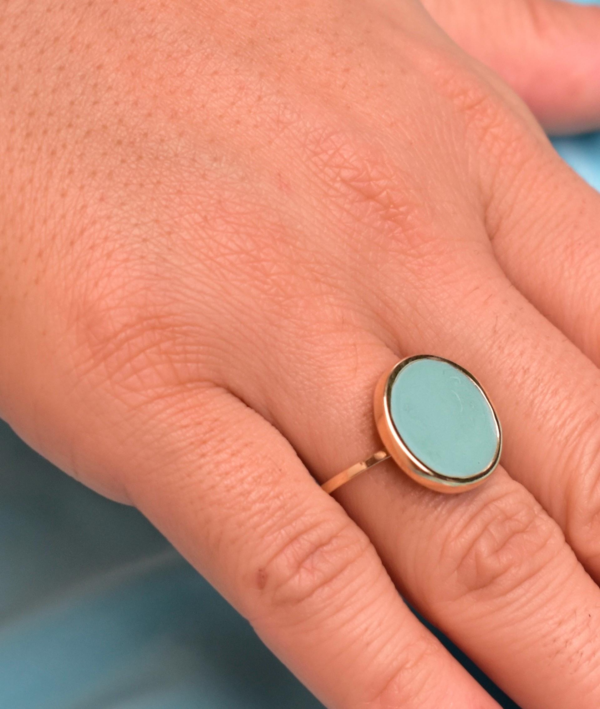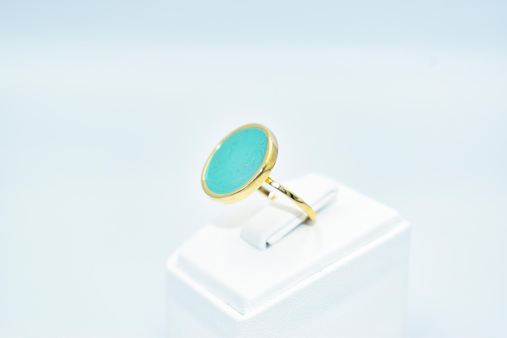Χρυσό δαχτυλίδι Κ14 με τιρκουάζ σμάλτο σε στρογγυλή καμπυλωτή επιφάνεια.
