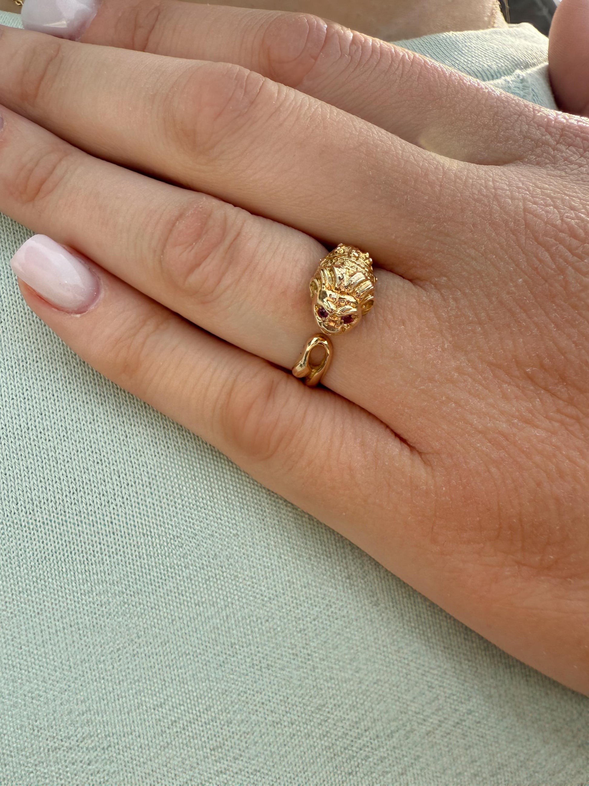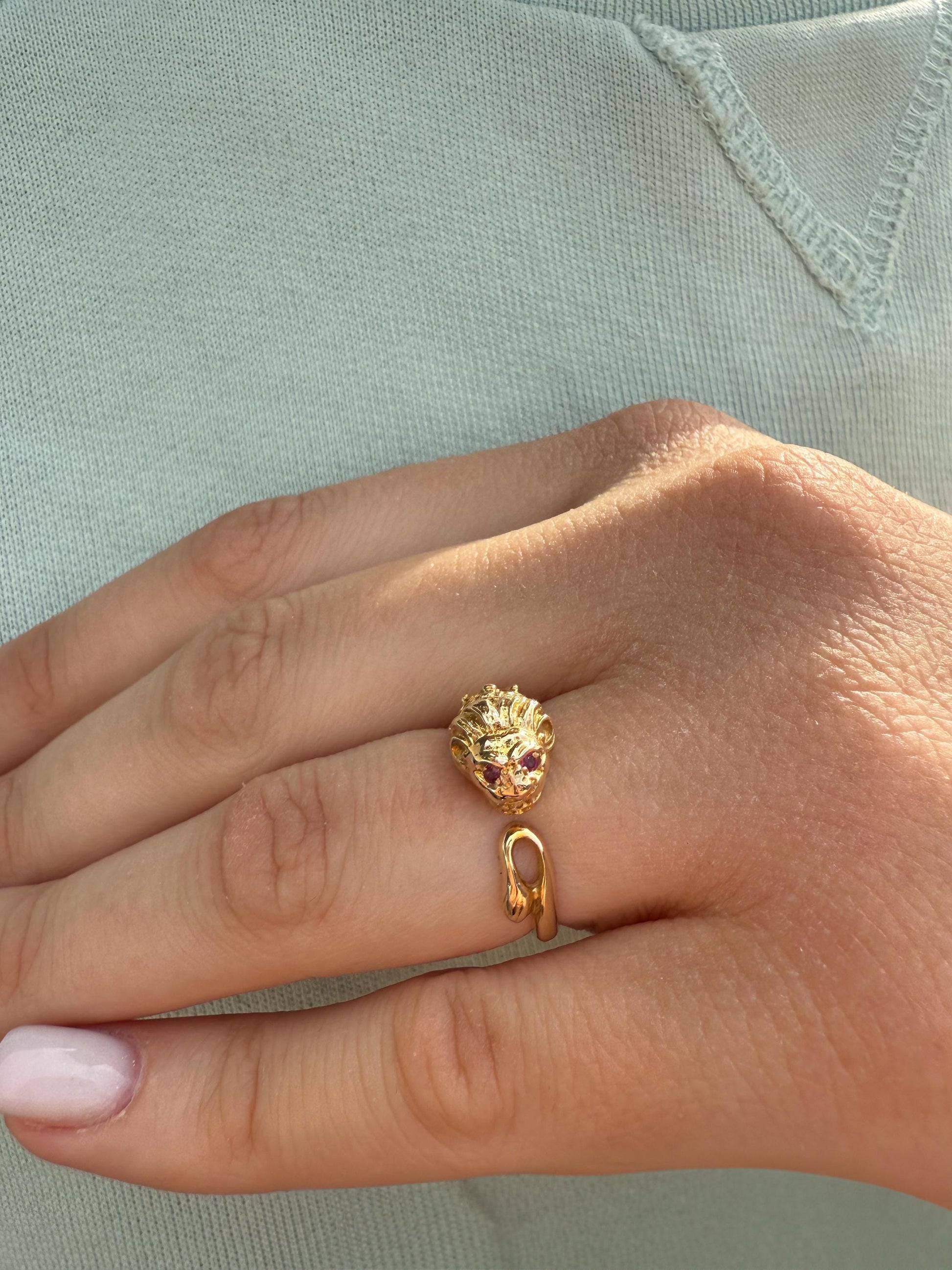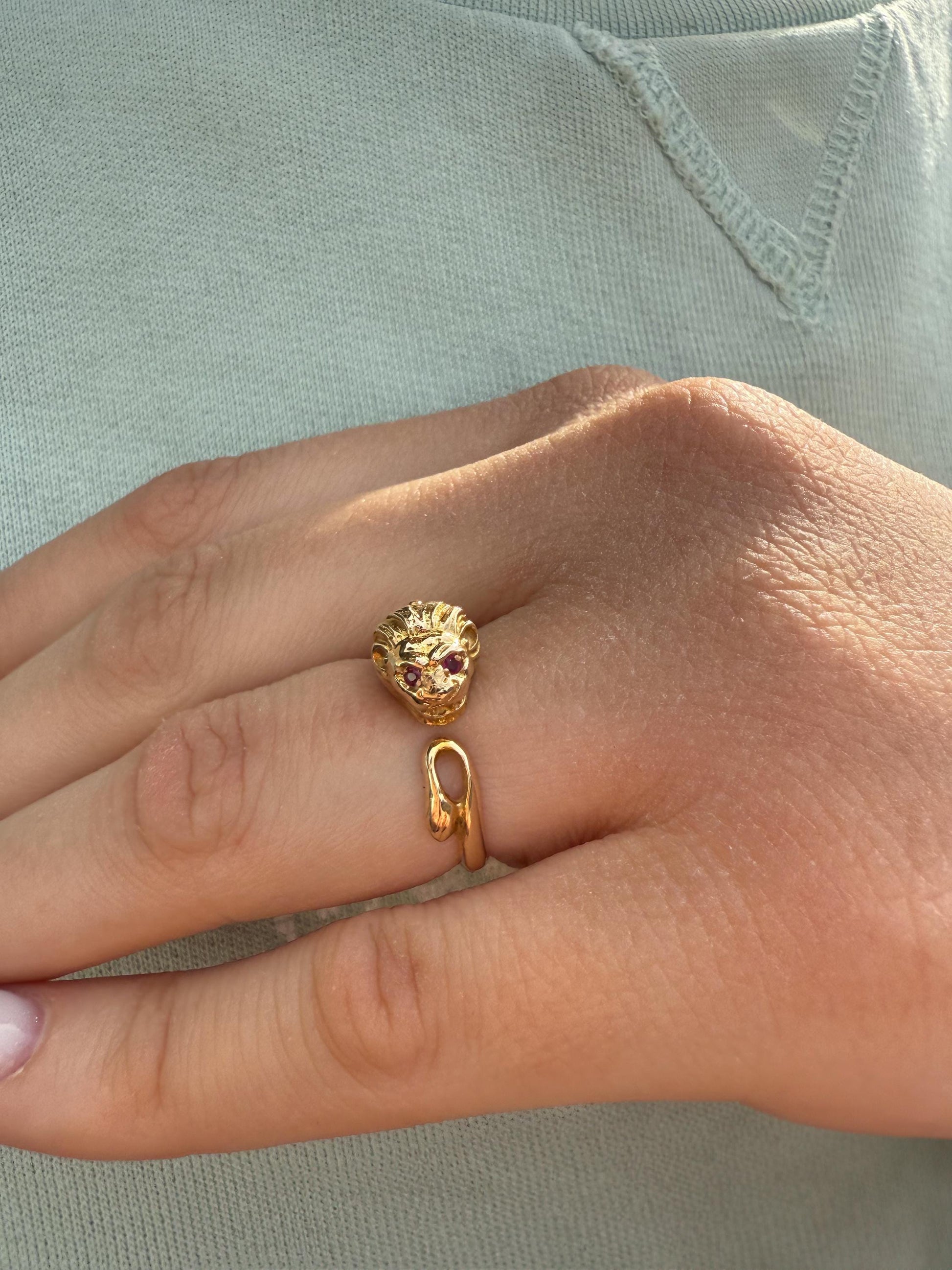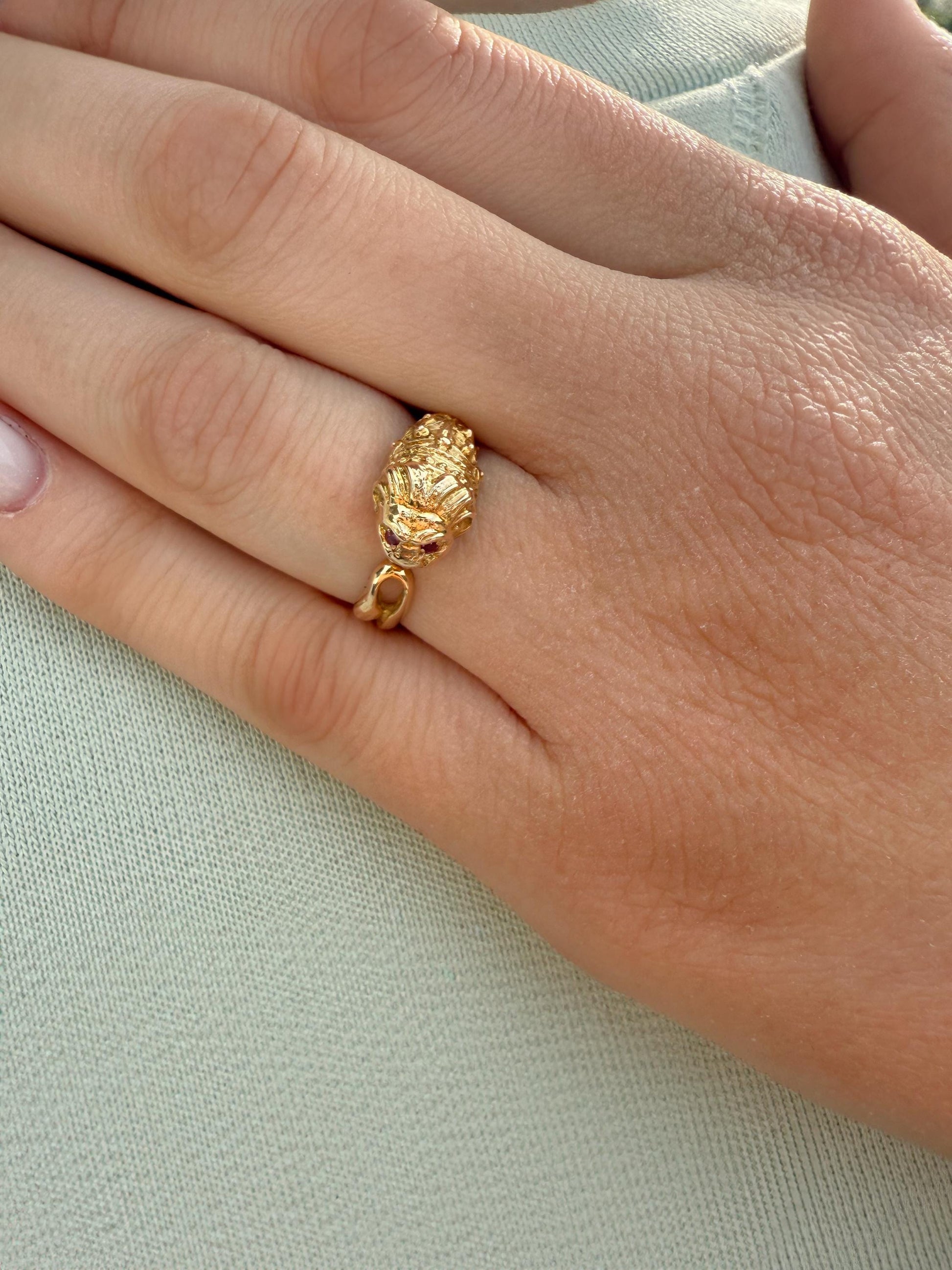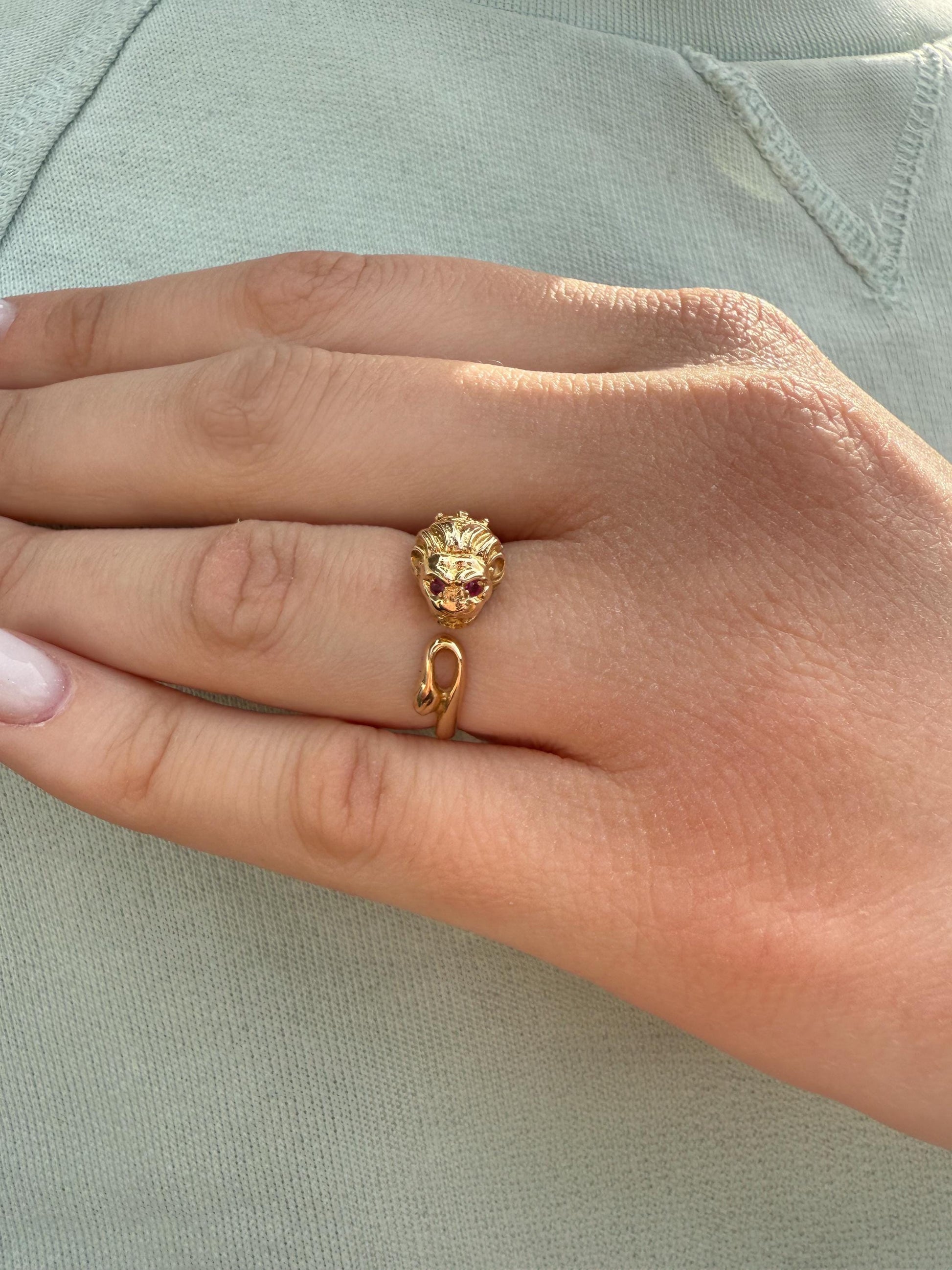 Χειροποίητο δαχτυλίδι Κ14 σε σχέδιο λιονταριού, με εντυπωσιακή τρισδιάστατη λεπτομέρεια και δύο κόκκινα ζιργκόν στα μάτια.