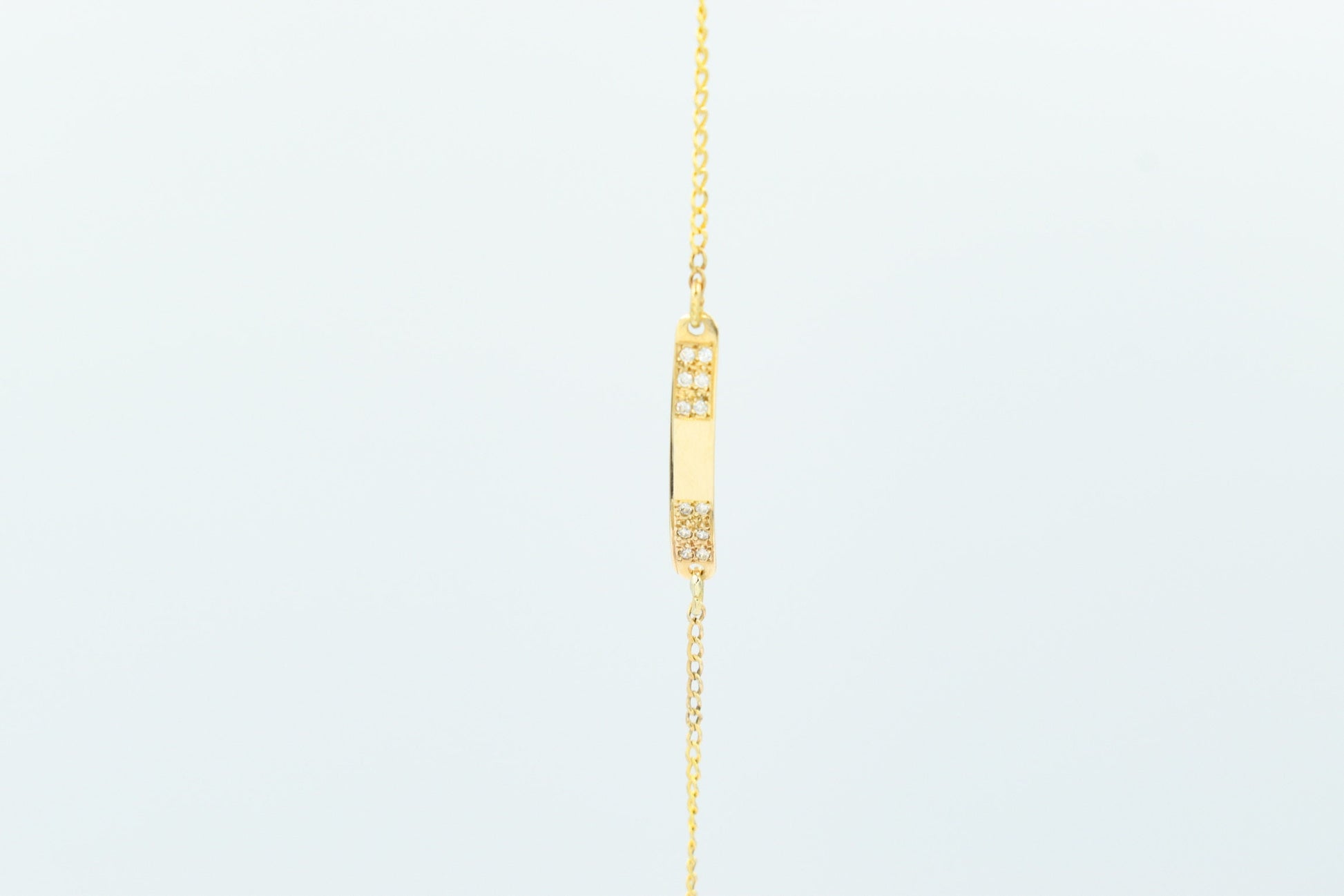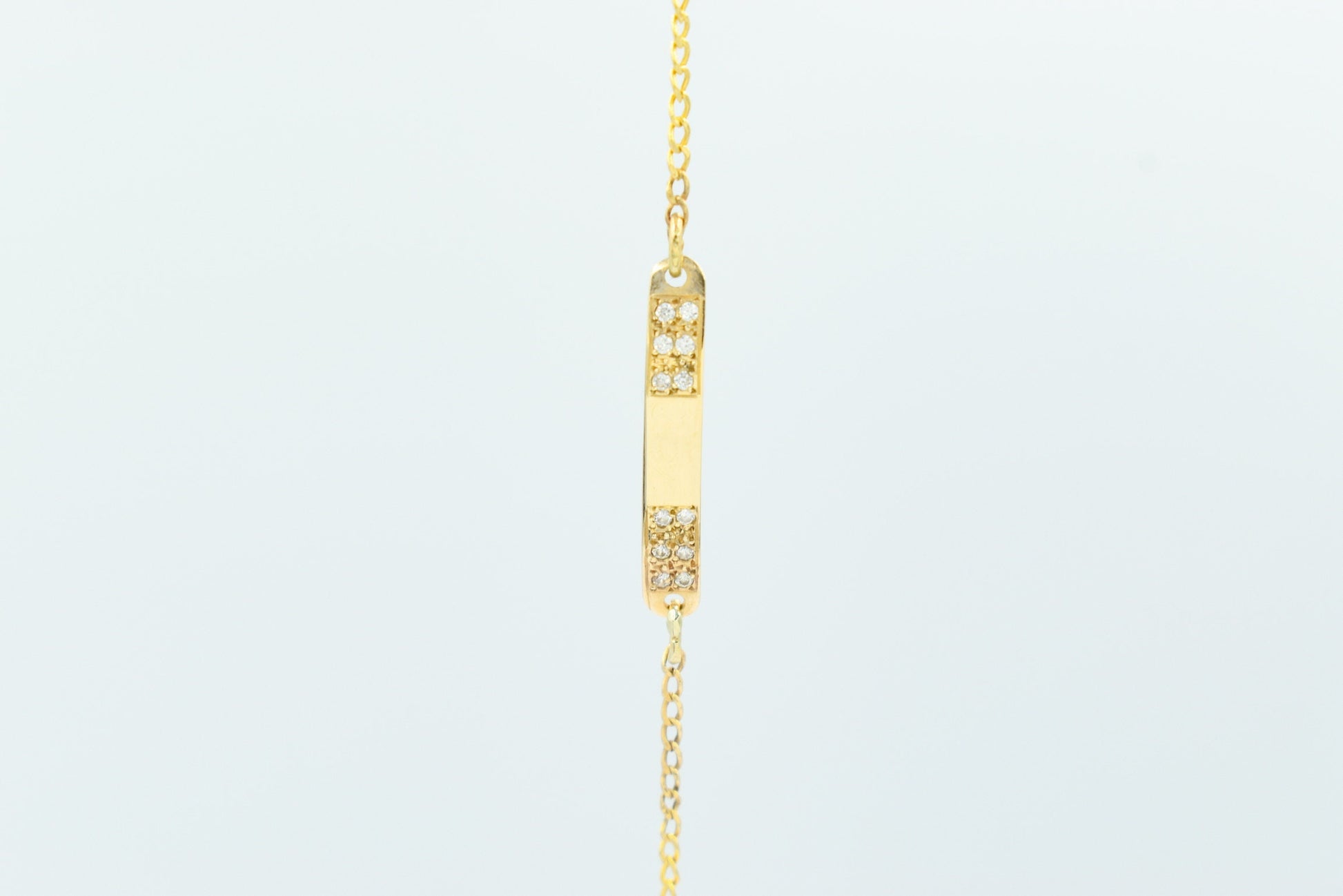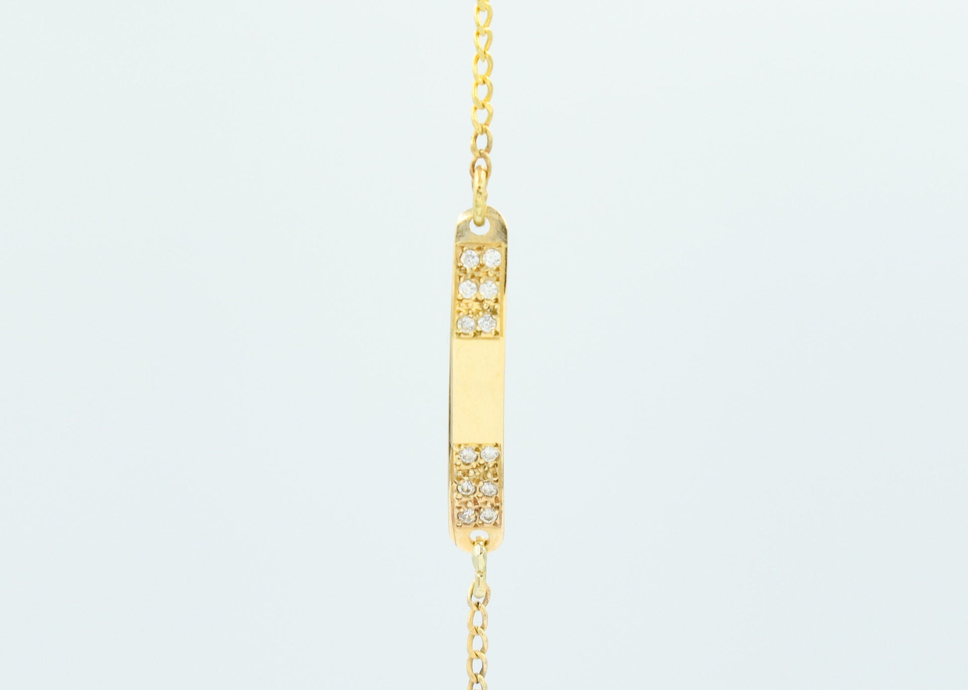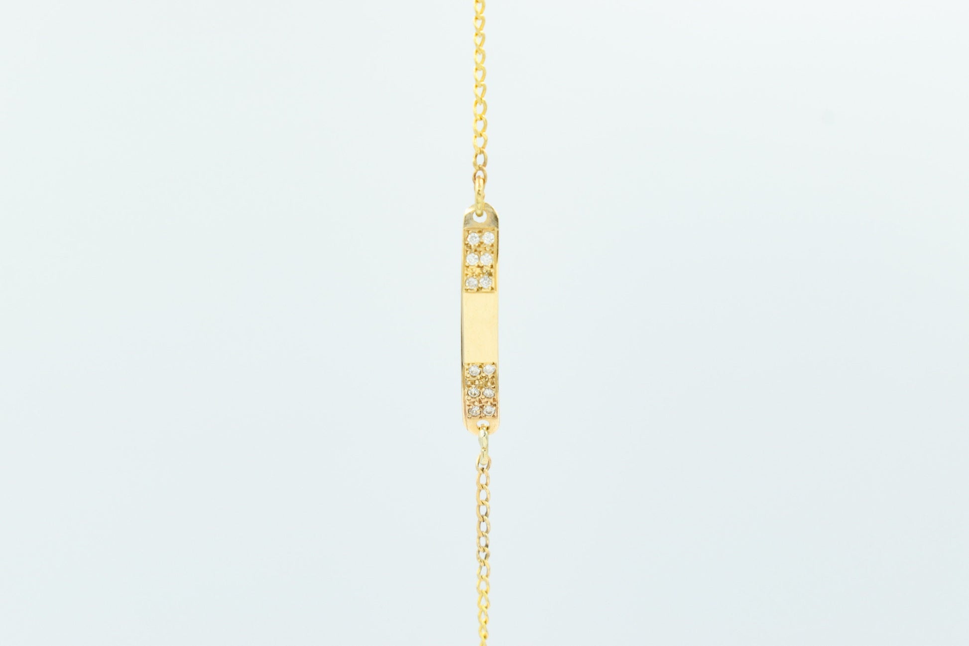 Χειροποίητη χρυσή ταυτότητα βραχιολιού Κ14 με λαμπερά λευκά ζιργκόν στις άκρες, ιδανική για καθημερινή χρήση αλλά και για δώρο σε ξεχωριστές περιστάσεις.