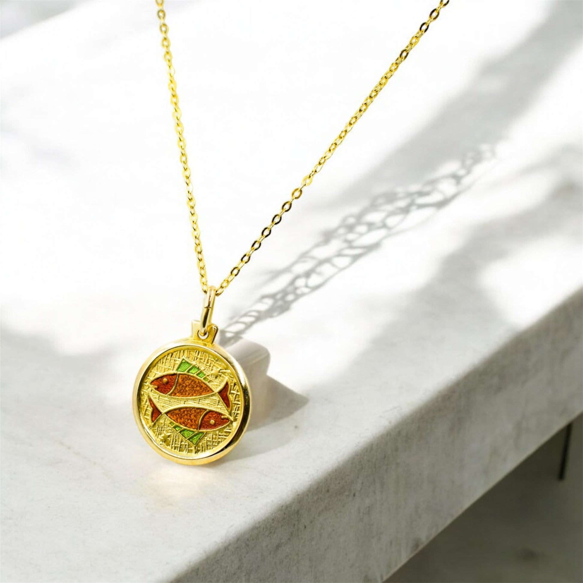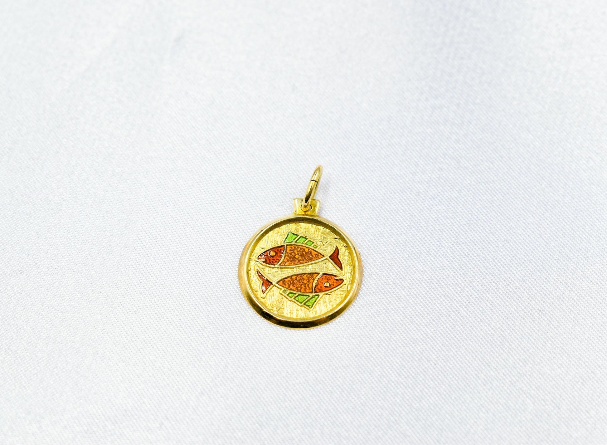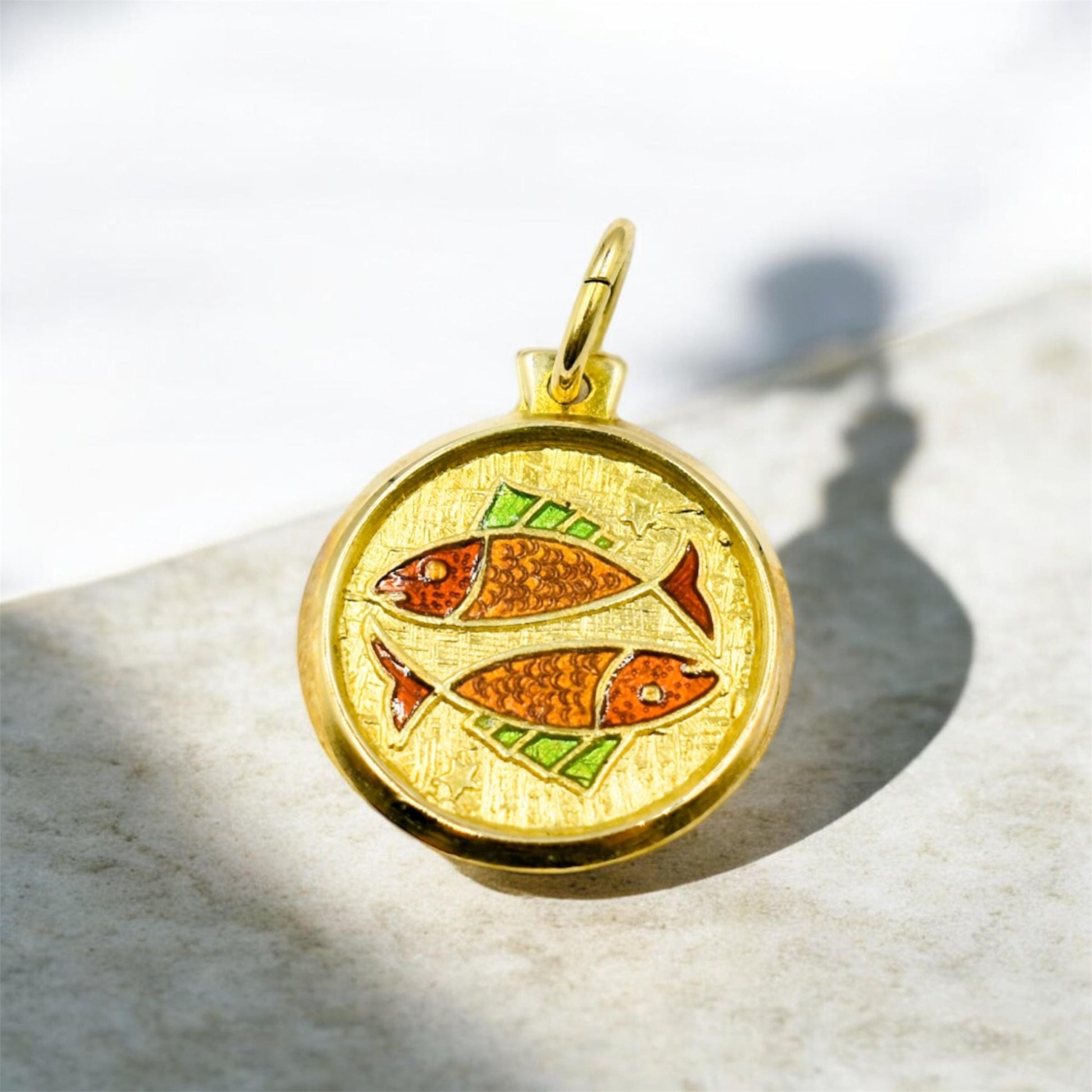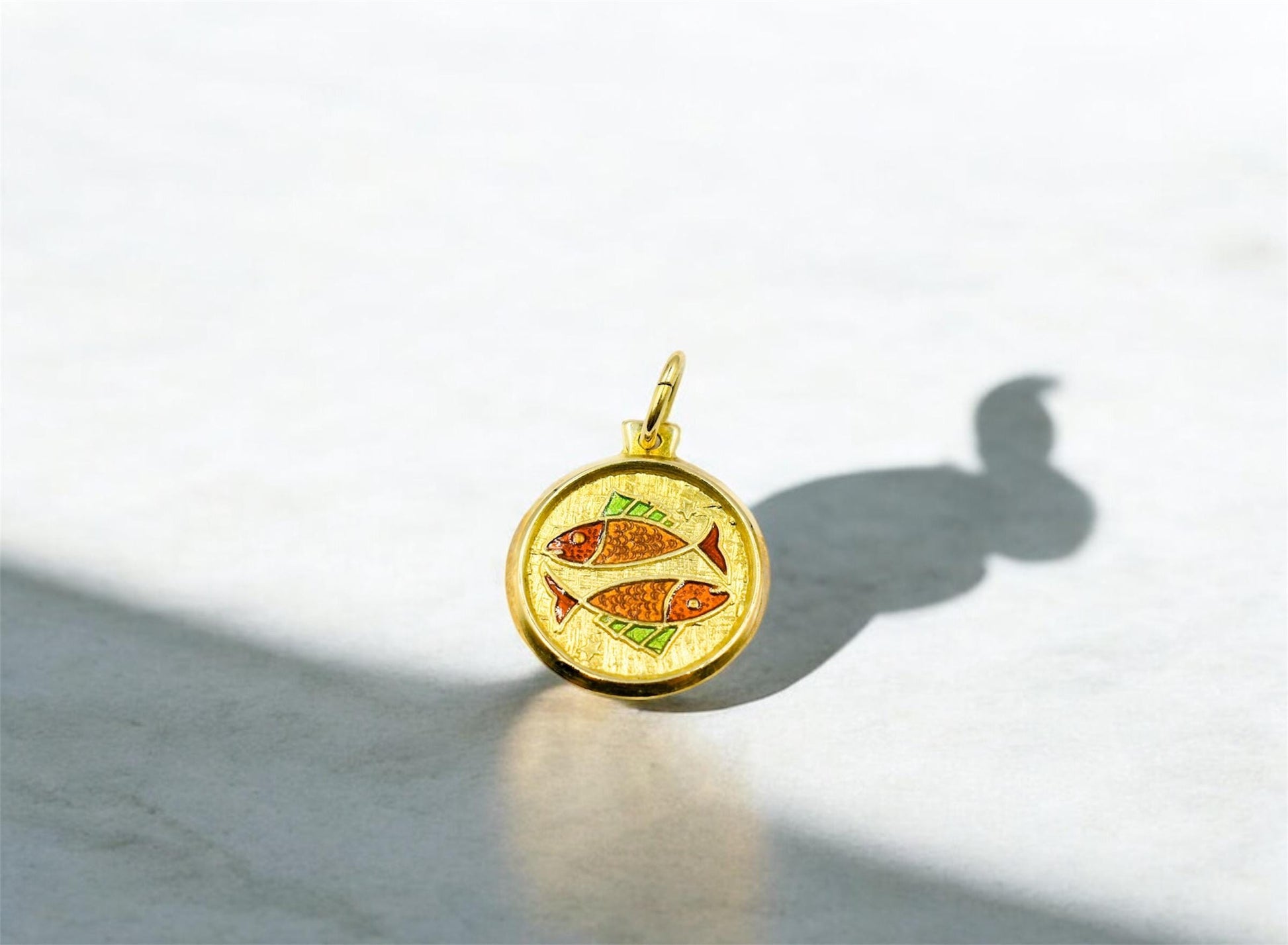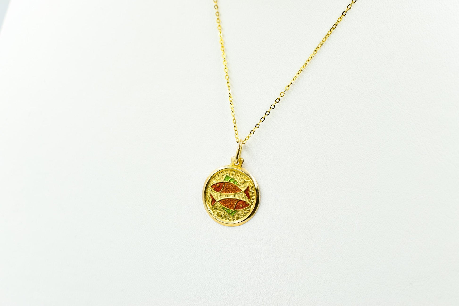 Ένα κομψό και φωτεινό μενταγιόν με το ζώδιο των Ιχθύων, φτιαγμένο σε χρυσό 14 καρατίων και διακοσμημένο με όμορφο, χρωματιστό σμάλτο. Είναι ένα κόσμημα που φοριέται καθημερινά και προσθέτει μια ιδιαίτερη, καλλιτεχνική πινελιά στο στυλ σας. ✨