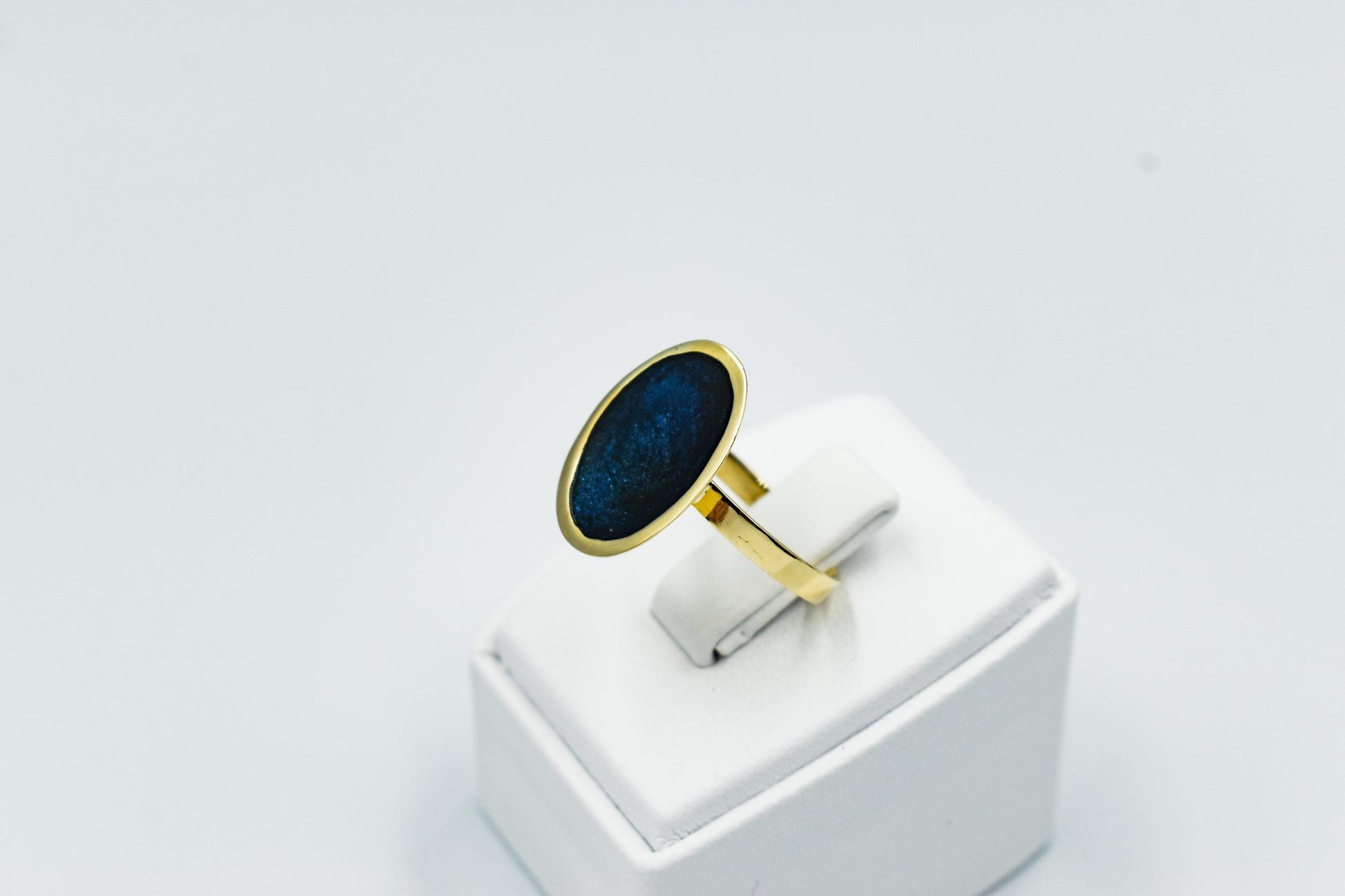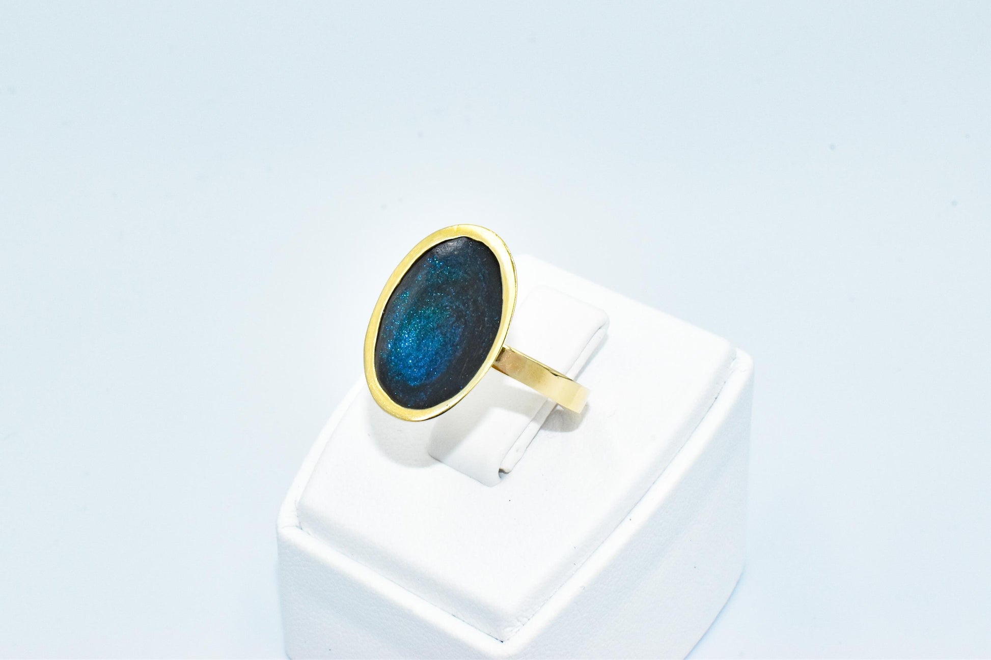 Εντυπωσιακό δαχτυλίδι Κ14 με μπλε σμάλτο σε οβάλ καμπυλωτή επιφάνεια.