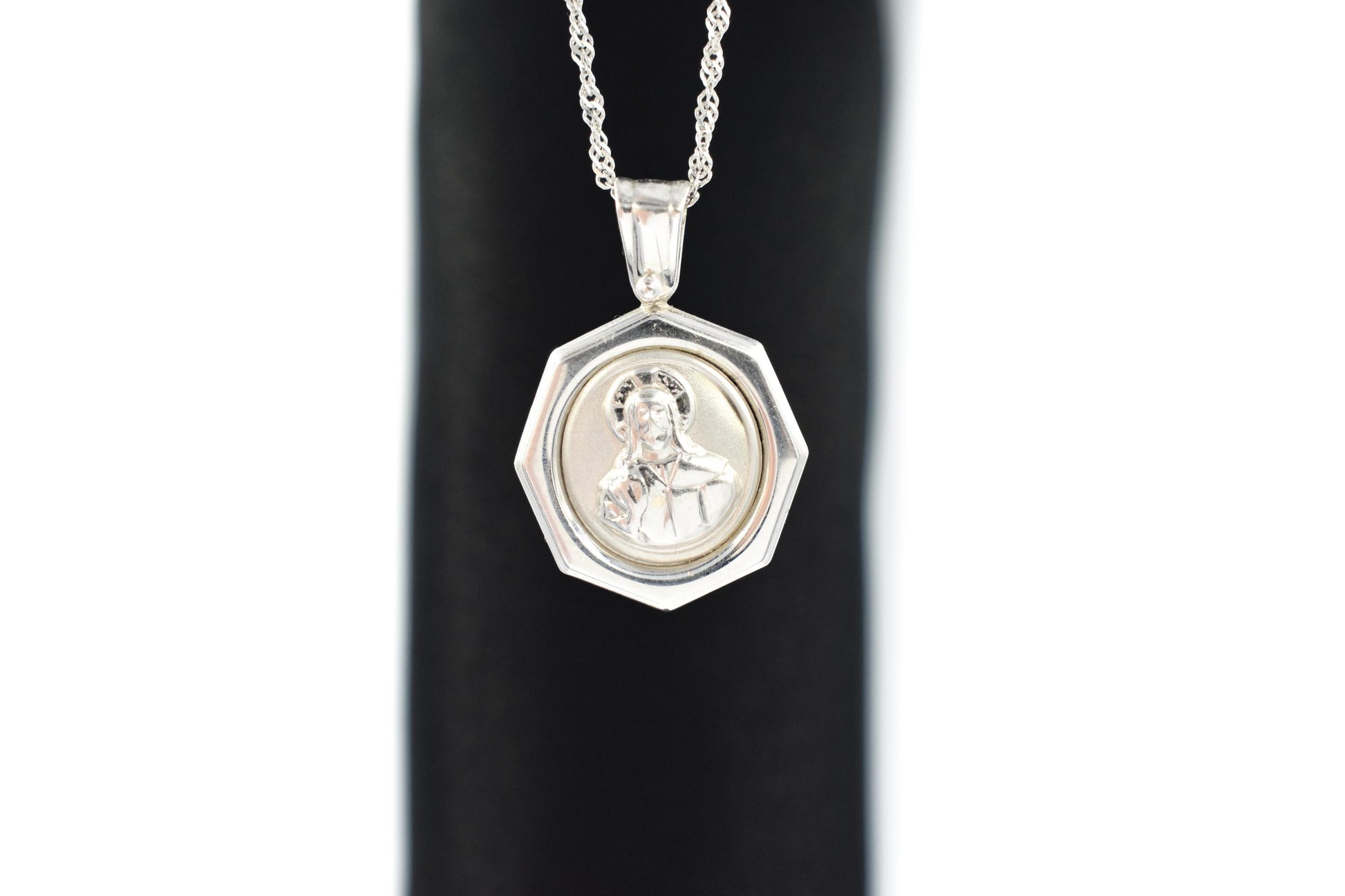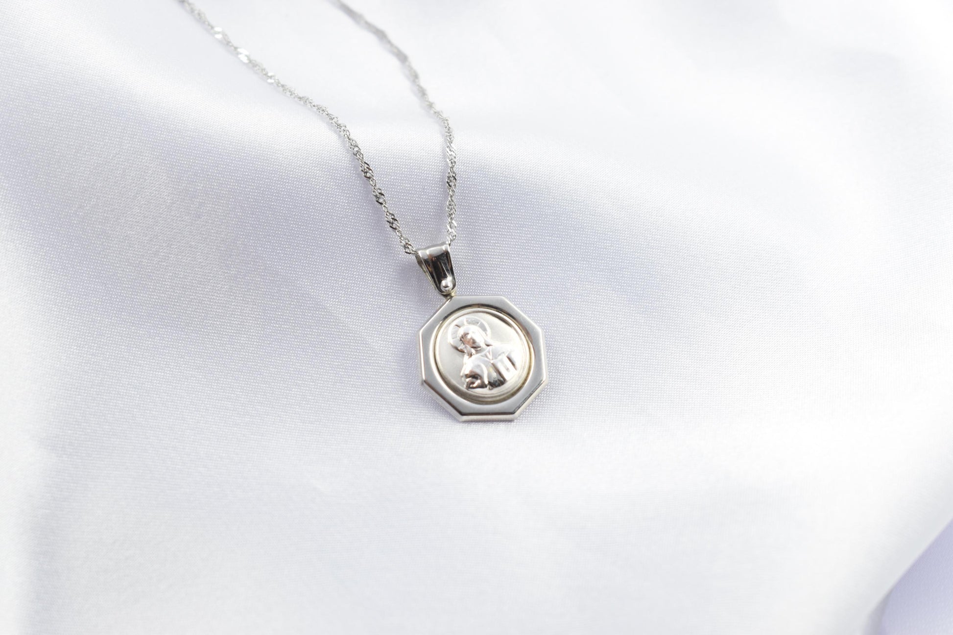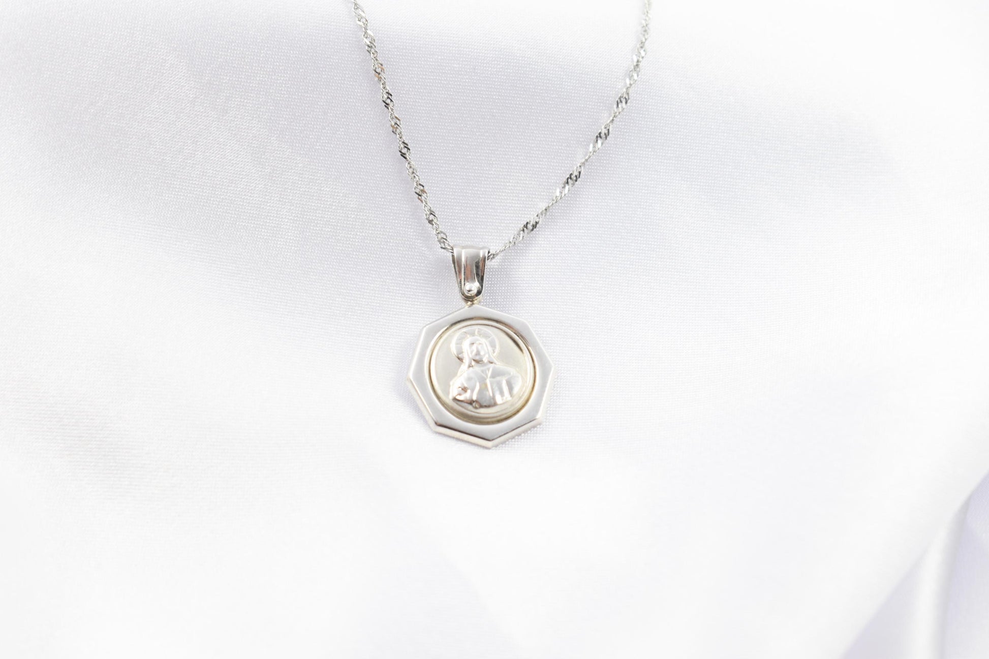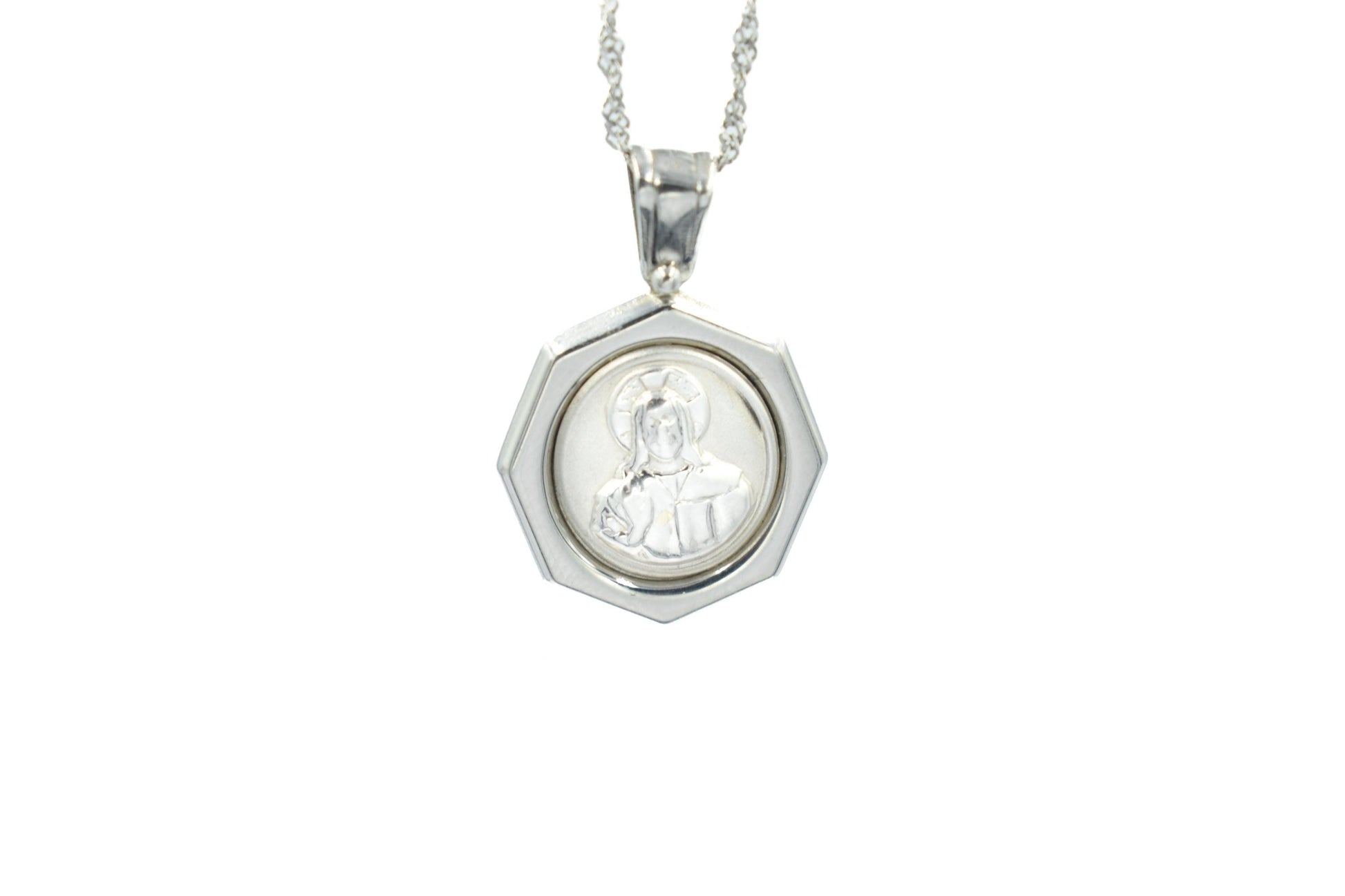 Εντυπωσιακό μενταγιόν σε λευκόχρυσο 14 καρατίων, με ανάγλυφη απεικόνιση του Χριστού σε οκτάγωνο πλαίσιο. Ο συνδυασμός του λευκού χρυσού με τον λεπτοδουλεμένο σχεδιασμό προσφέρει ένα ιδιαίτερο και κομψό αποτέλεσμα, ιδανικό τόσο για καθημερινή χρήση όσο και για ιδιαίτερες περιστάσεις. ✨