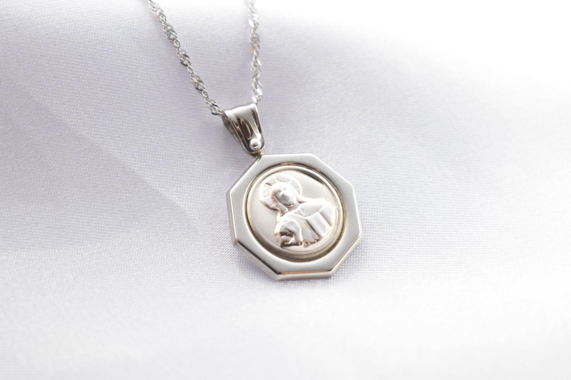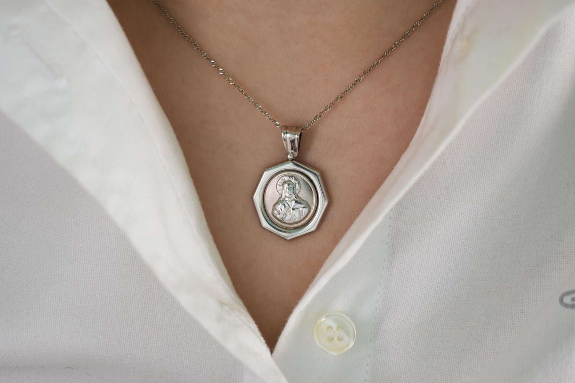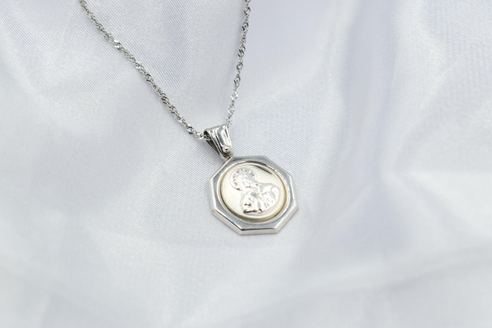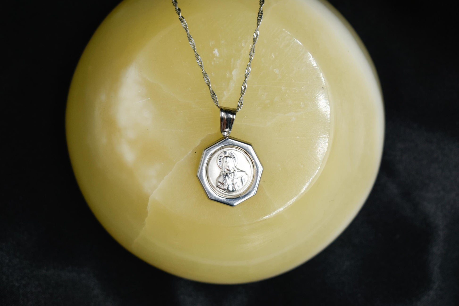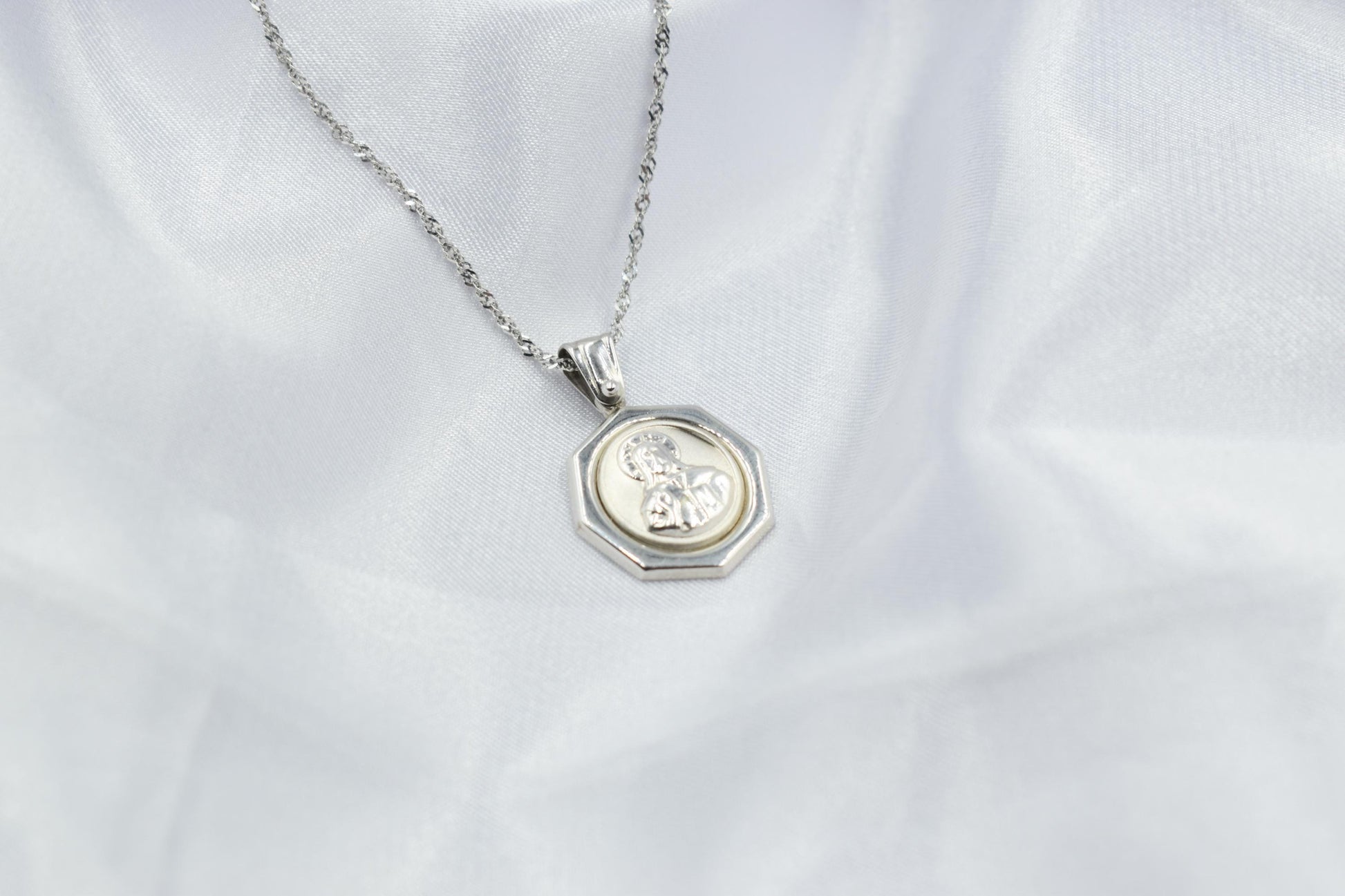 Εντυπωσιακό μενταγιόν σε λευκόχρυσο 14 καρατίων, με ανάγλυφη απεικόνιση του Χριστού σε οκτάγωνο πλαίσιο. Ο συνδυασμός του λευκού χρυσού με τον λεπτοδουλεμένο σχεδιασμό προσφέρει ένα ιδιαίτερο και κομψό αποτέλεσμα, ιδανικό τόσο για καθημερινή χρήση όσο και για ιδιαίτερες περιστάσεις. ✨