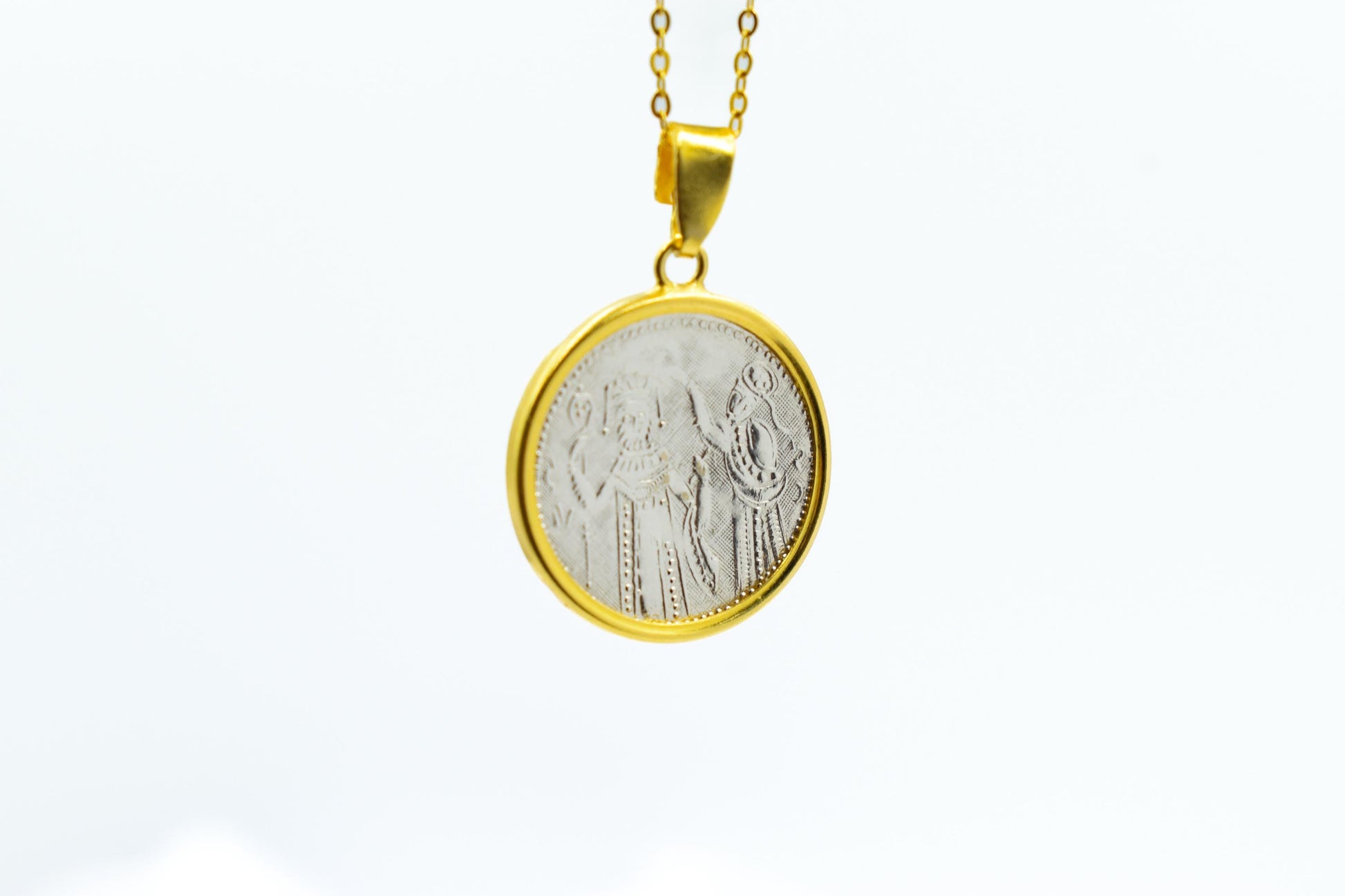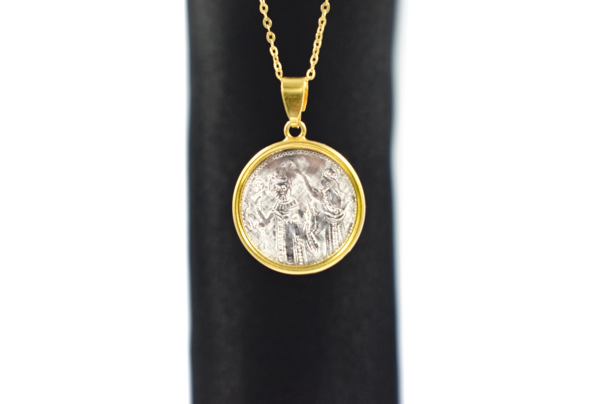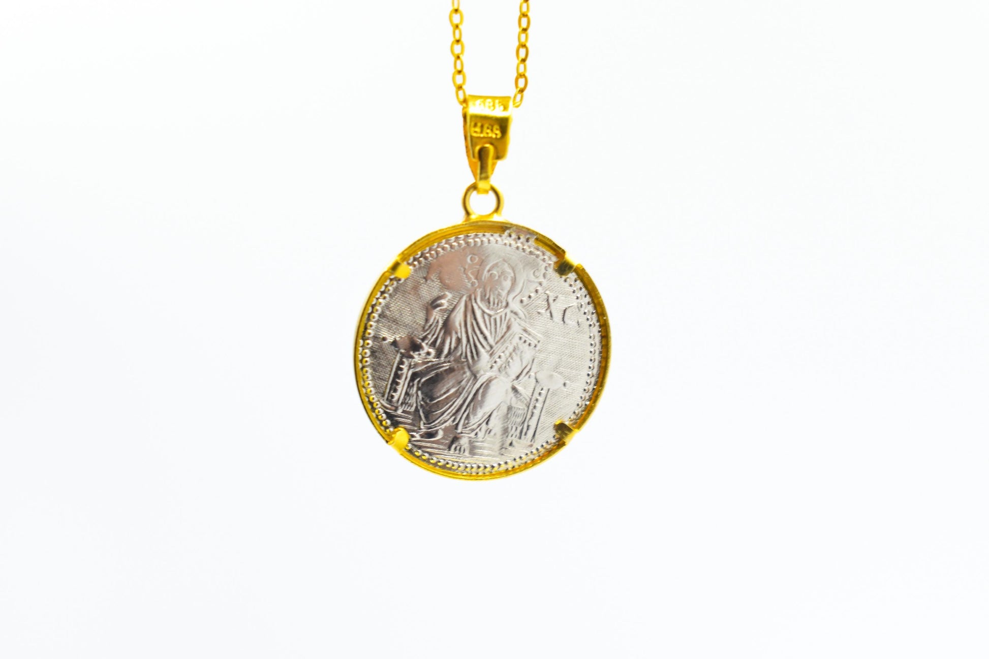 Κλασικό και διαχρονικό κωνσταντινάτο διπλής όψης, κατασκευασμένο από χρυσό 14 καρατίων. Ο εξωτερικός κύκλος είναι σε κίτρινο χρυσό, ενώ το εσωτερικό ανάγλυφο στοιχείο είναι σε λευκό χρυσό, δημιουργώντας μια υπέροχη δίχρωμη αντίθεση. ✨