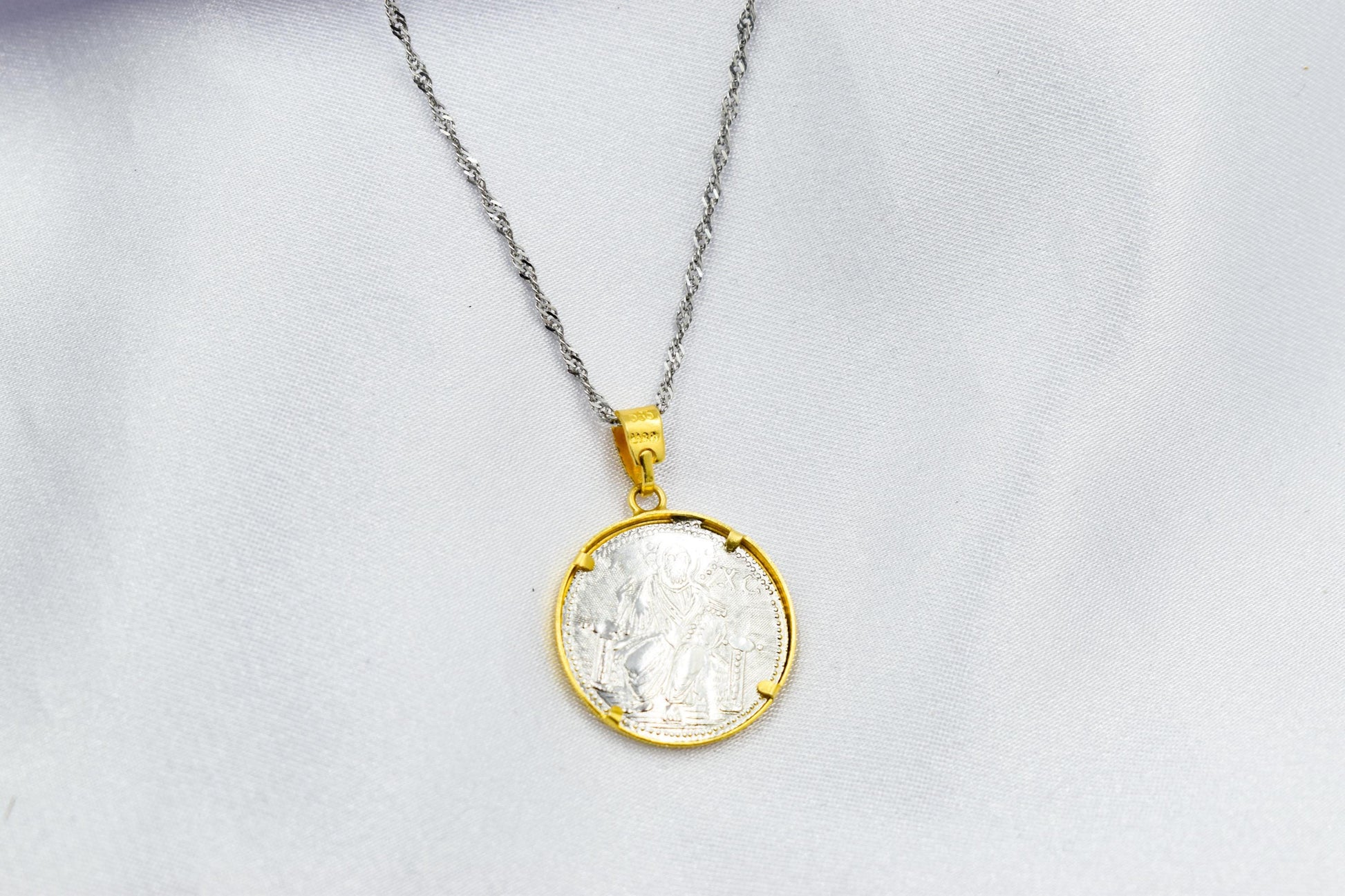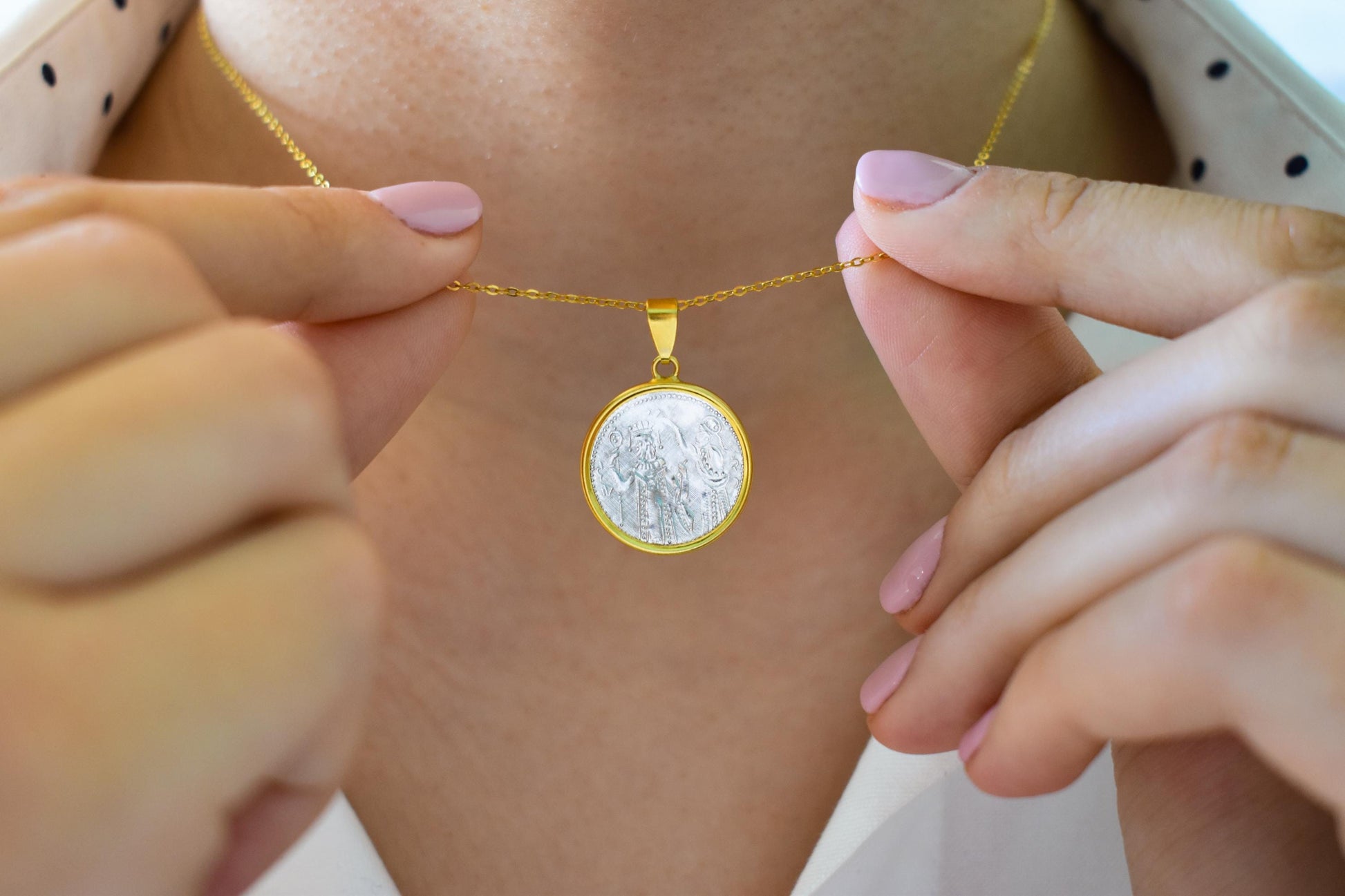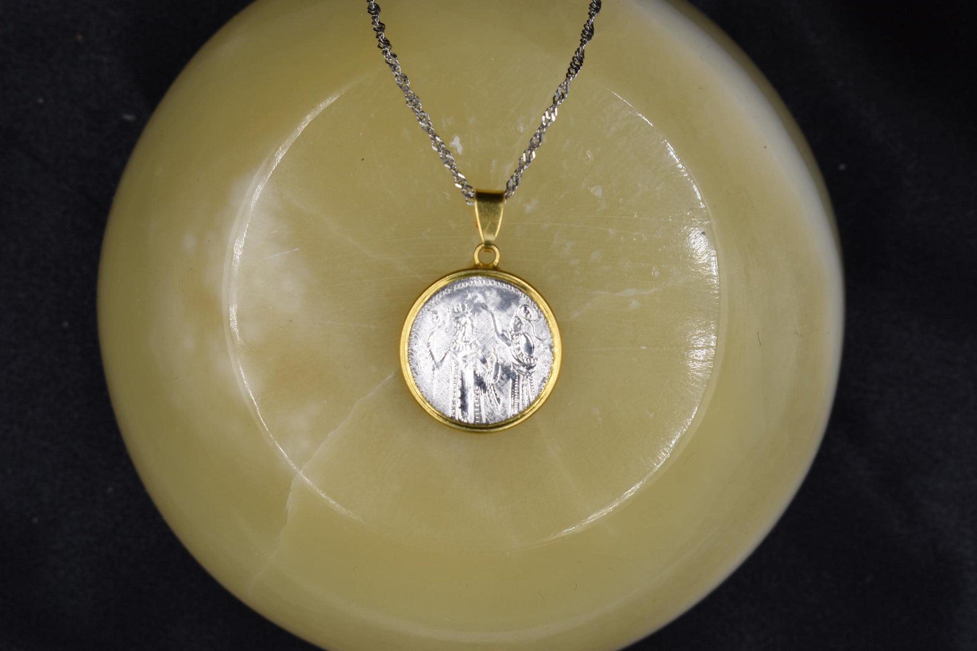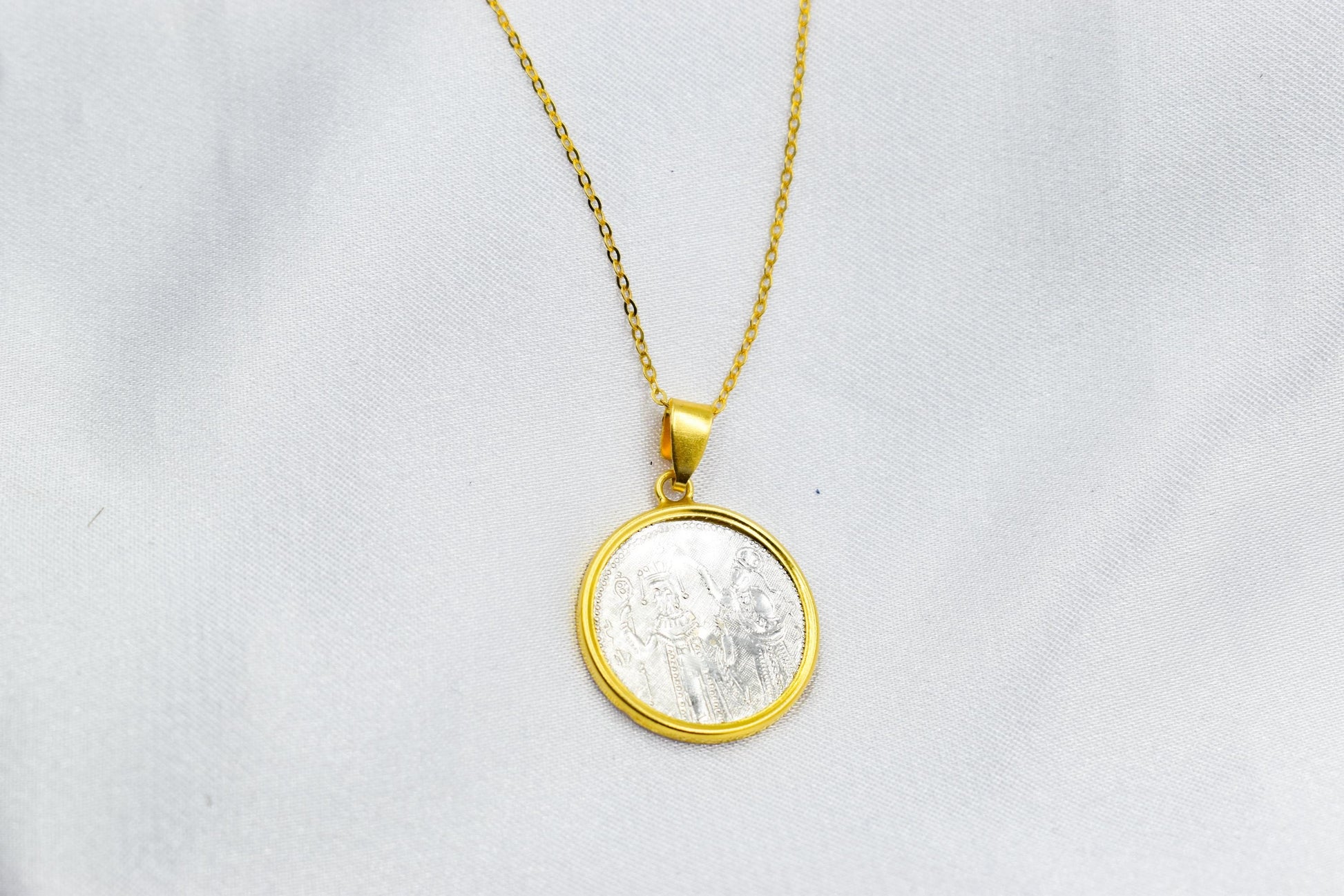 Κλασικό και διαχρονικό κωνσταντινάτο διπλής όψης, κατασκευασμένο από χρυσό 14 καρατίων. Ο εξωτερικός κύκλος είναι σε κίτρινο χρυσό, ενώ το εσωτερικό ανάγλυφο στοιχείο είναι σε λευκό χρυσό, δημιουργώντας μια υπέροχη δίχρωμη αντίθεση. ✨