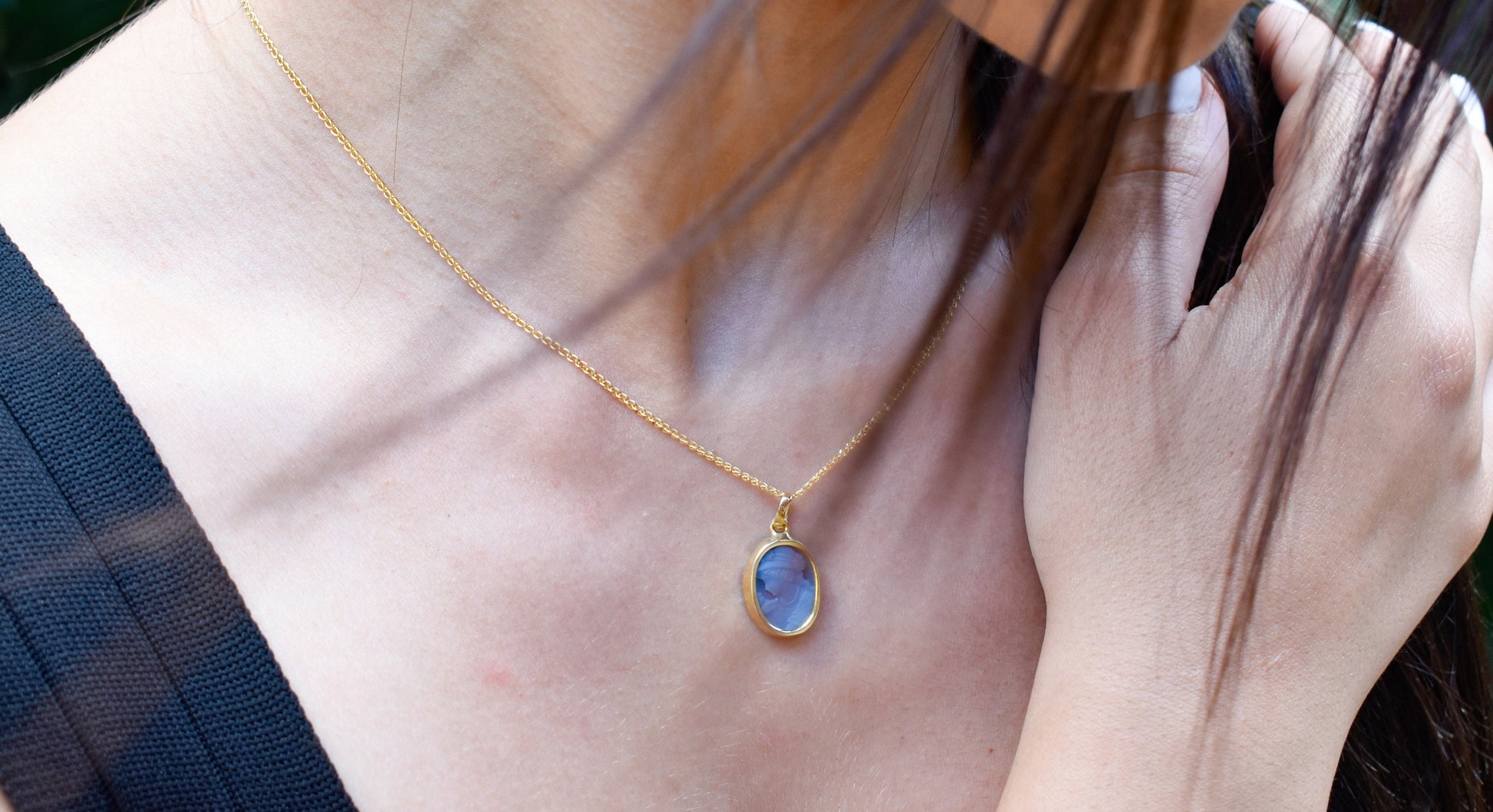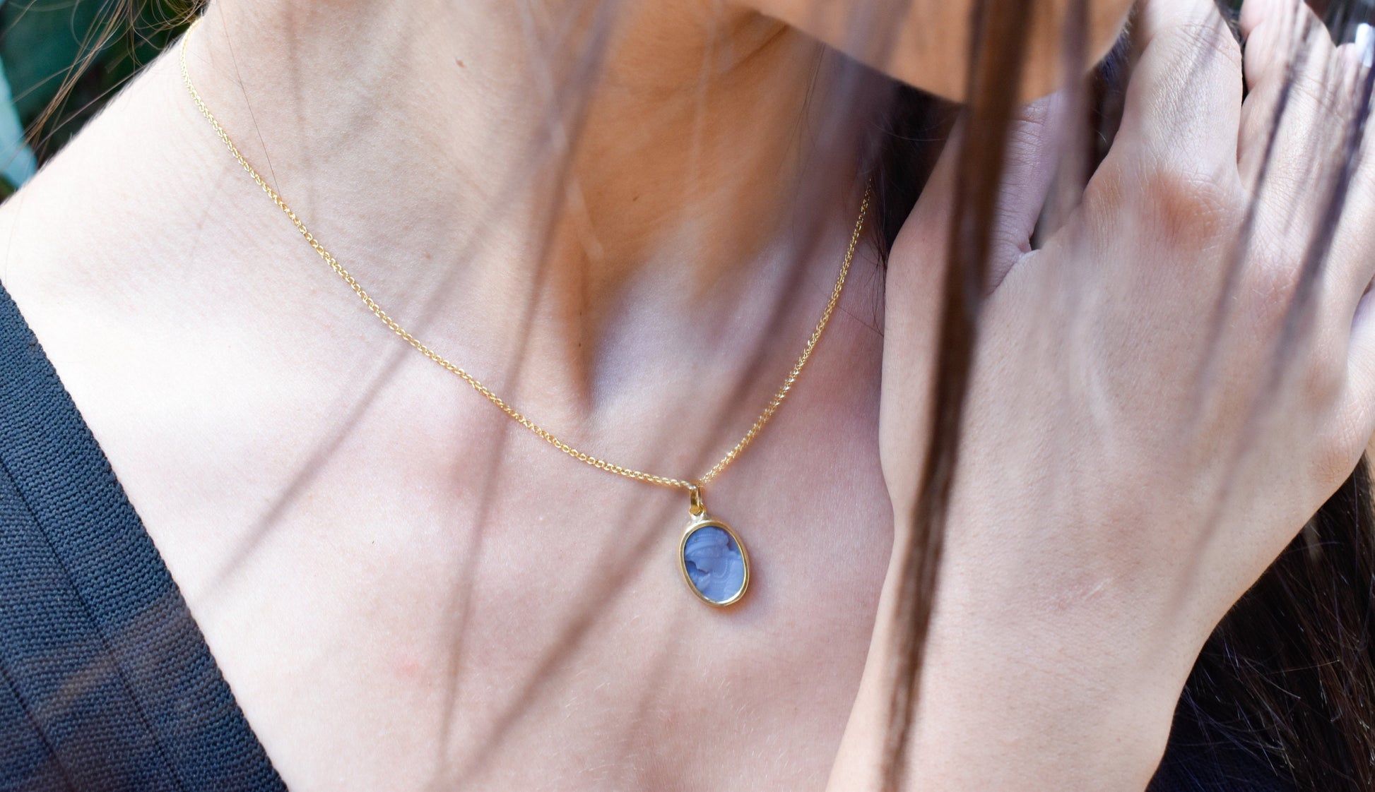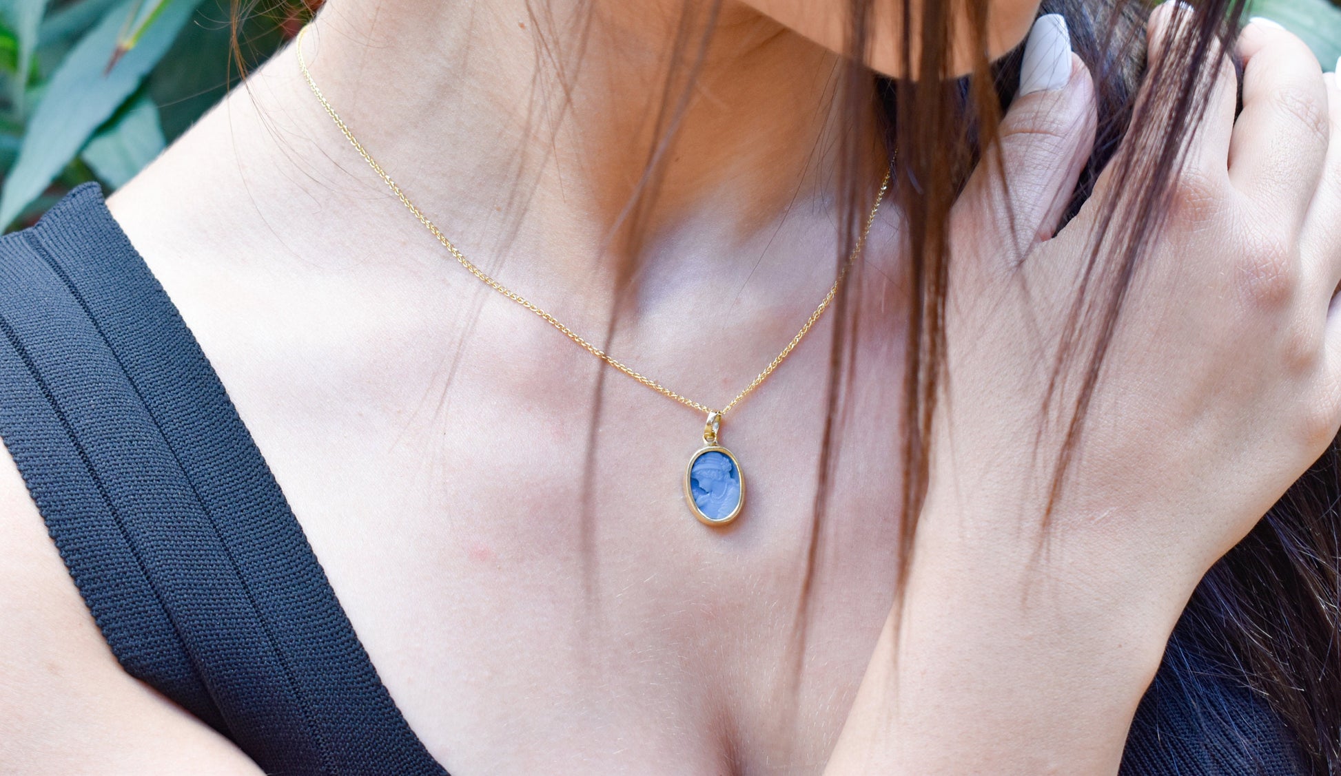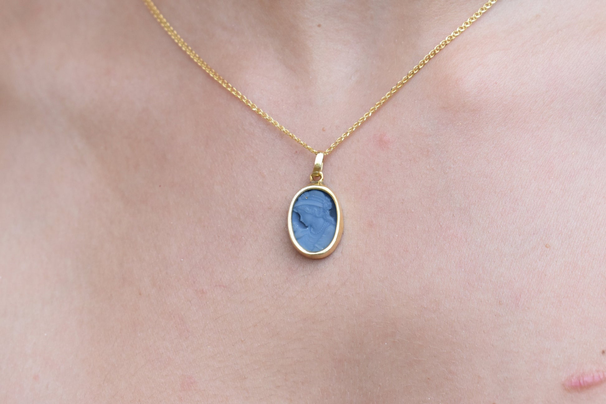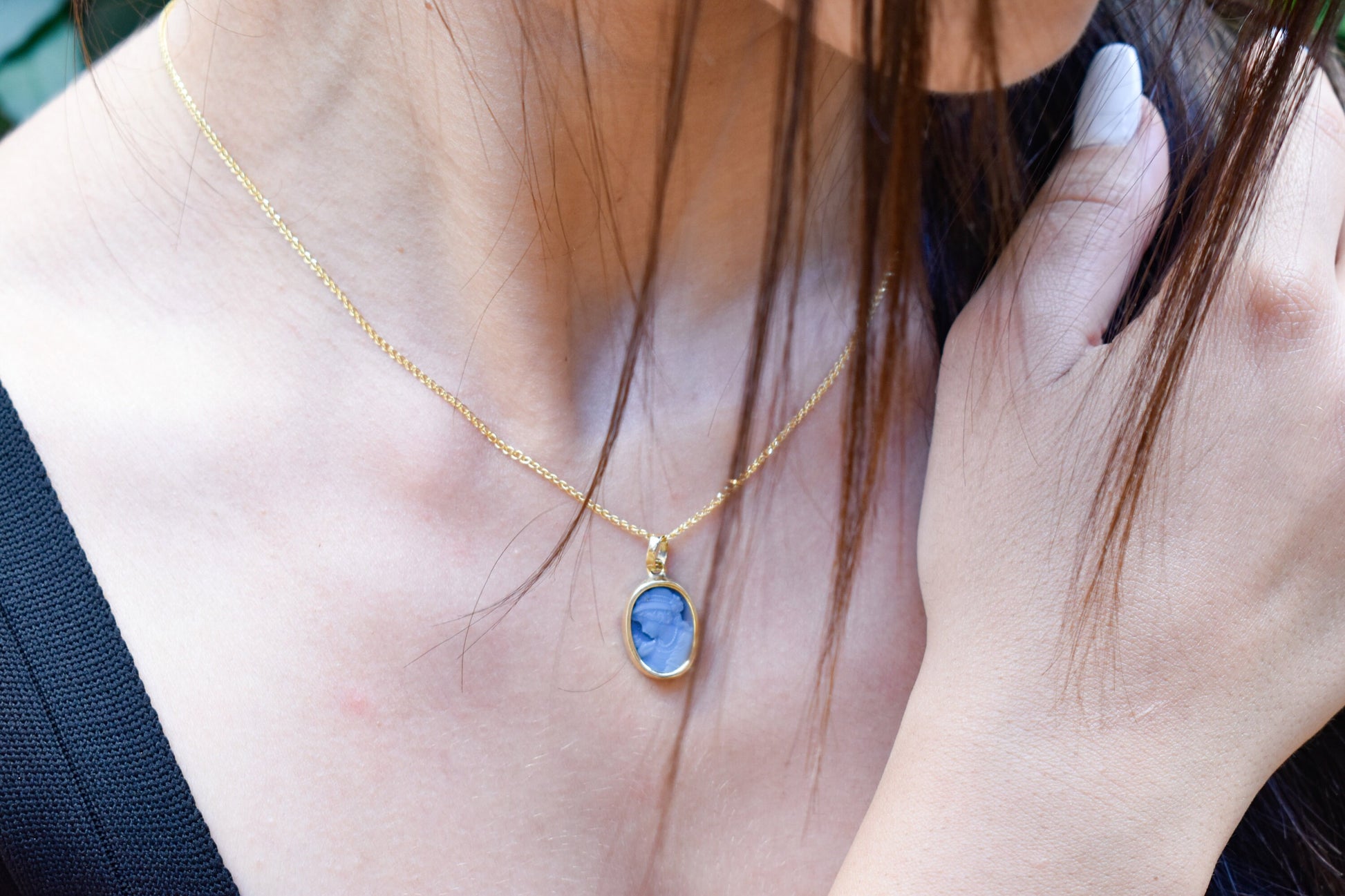 Ένα μοναδικό χρυσό καμέο 18 καρατίων με χειροποίητο όστρακο σε μπλε χρώμα. Το λεπτεπίλεπτο ανάγλυφο πρόσωπο δίνει έναν αέρα ρομαντισμού και vintage κομψότητας, ενώ το χρυσό πλαίσιο τονίζει την ομορφιά του καμέο. ✨