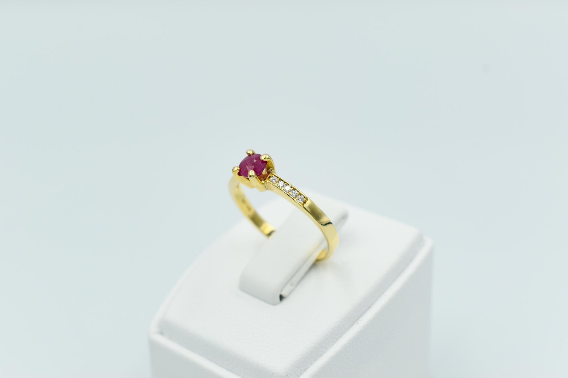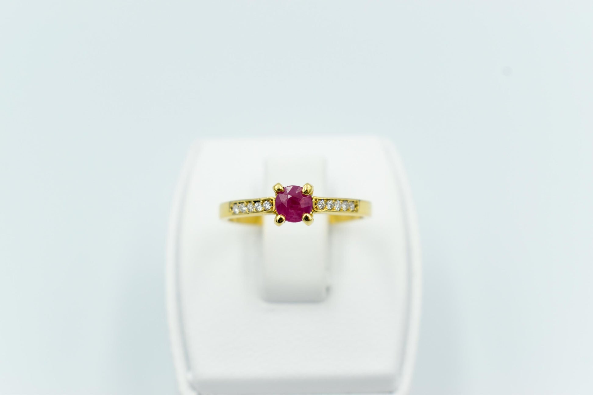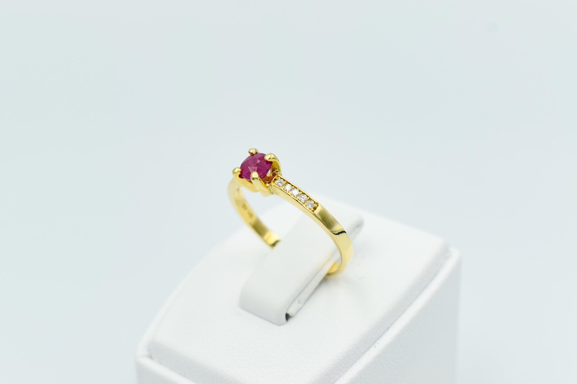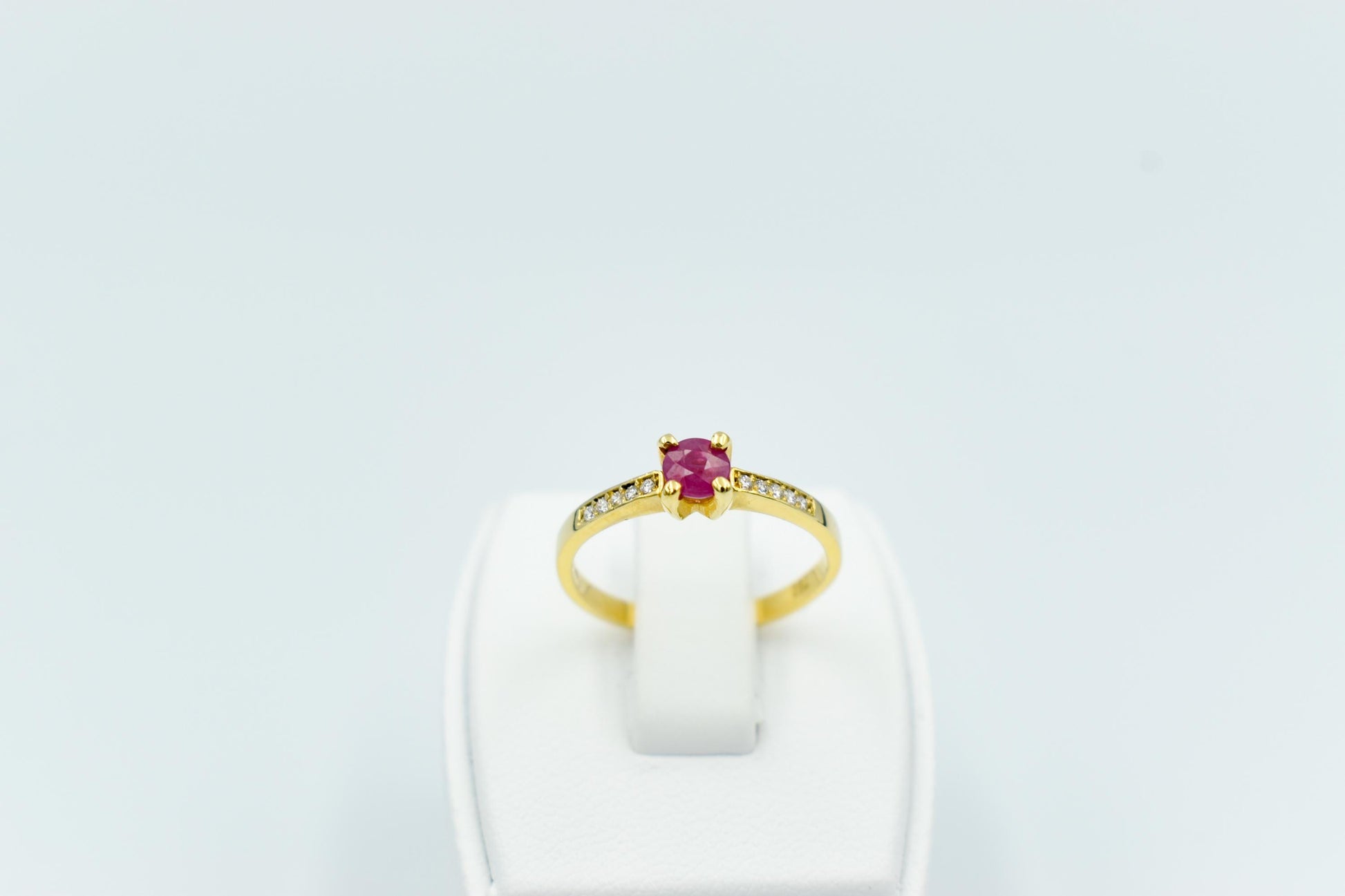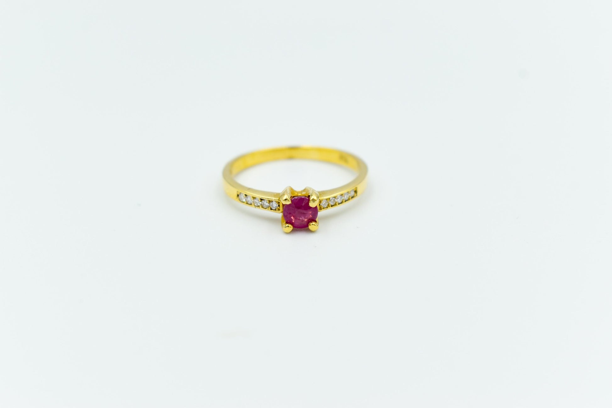 Λεπτό, κομψό μονόπετρο δαχτυλίδι από χρυσό 18 καρατίων με αυθεντικό ορυκτό ρουμπίνι στο κέντρο και διαμαντάκια μπριγιάν δεξιά και αριστερά.