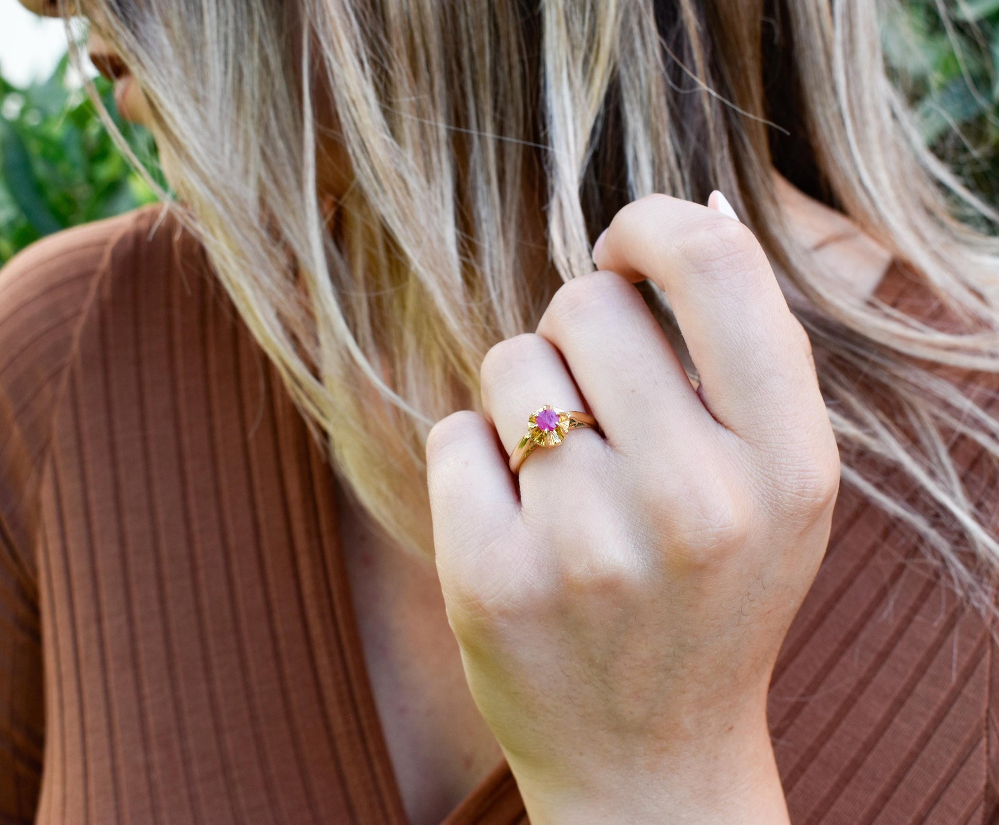 Ο λαμπερός κόκκινος λίθος είναι σφηνοθετημένος σε κομψή στεφάνη, προσφέροντας διαχρονική αισθητική και διακριτική πολυτέλεια. ✨