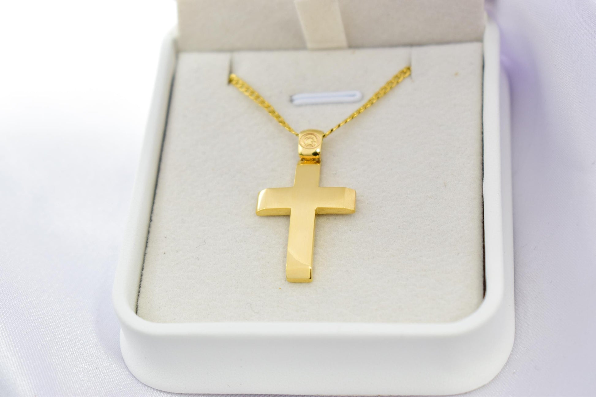 This unique two-tone solid gold cross necklace combines tradition with distinctive design. The cross pendant is crafted in solid 9K yellow gold, while the chain is made of 14K yellow gold – offering both durability and elegance.