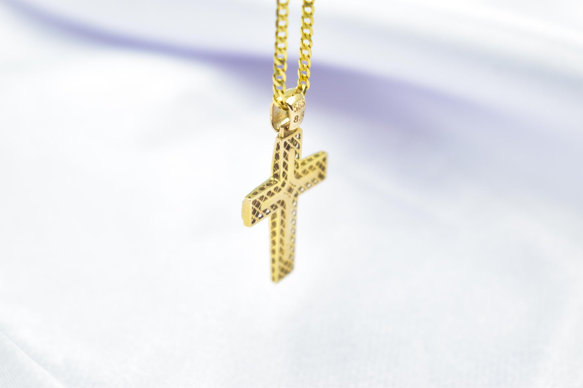 Elevate your jewelry collection with this unique 14K solid gold cross pendant, exquisitely designed with fine craftsmanship and spiritual significance. This cross features a stunning double-sided design — the front showcases a distinctive engraved and textured finish with a refined inner cross line that reflects light beautifully, while the back displays an elegant openwork lattice pattern, offering a touch of sophistication and a sense of lightness to the piece.