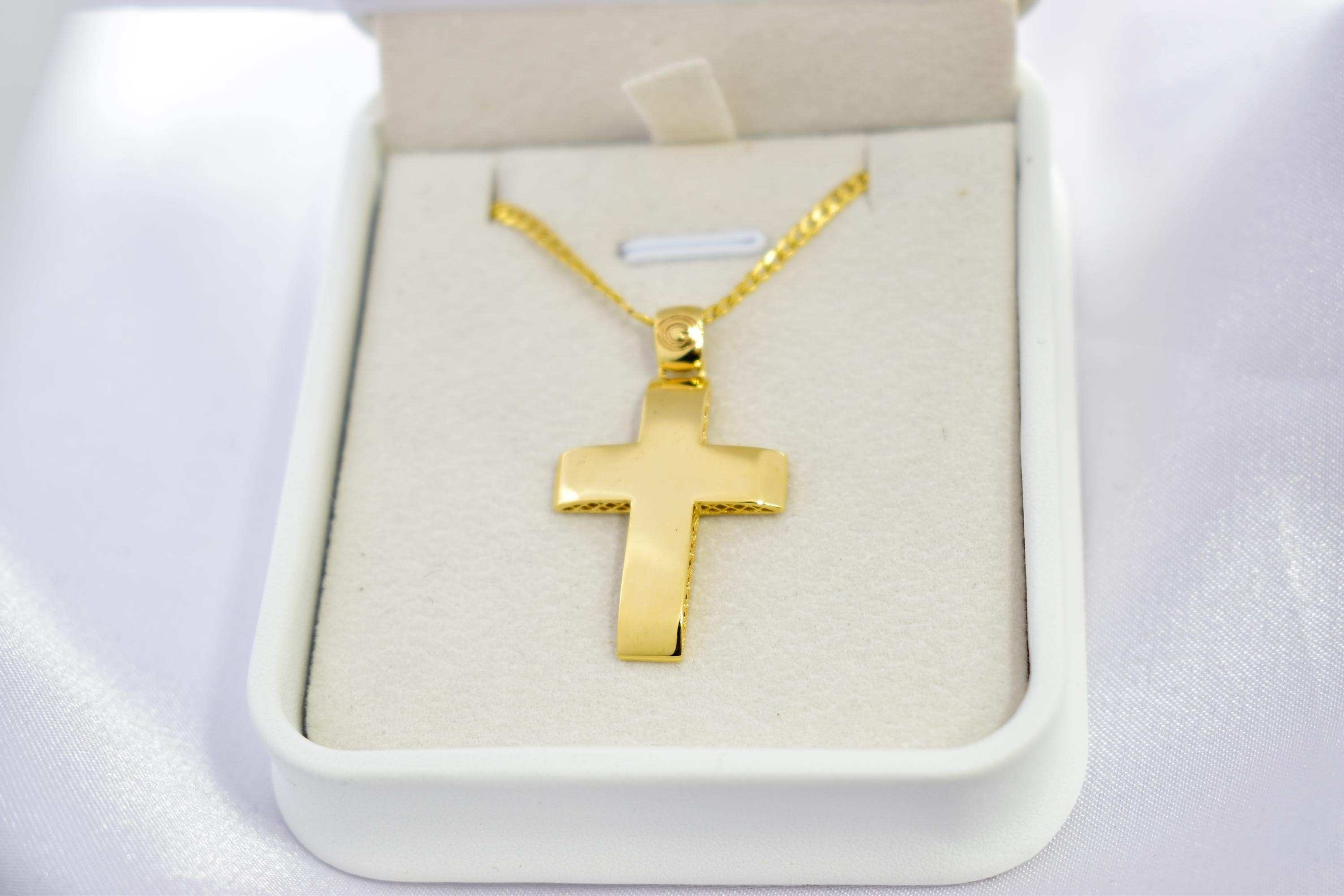Made from genuine 14K gold (hallmarked “585”), this cross is perfect for daily wear or special religious occasions. You can purchase it with or without a matching 14K gold chain.