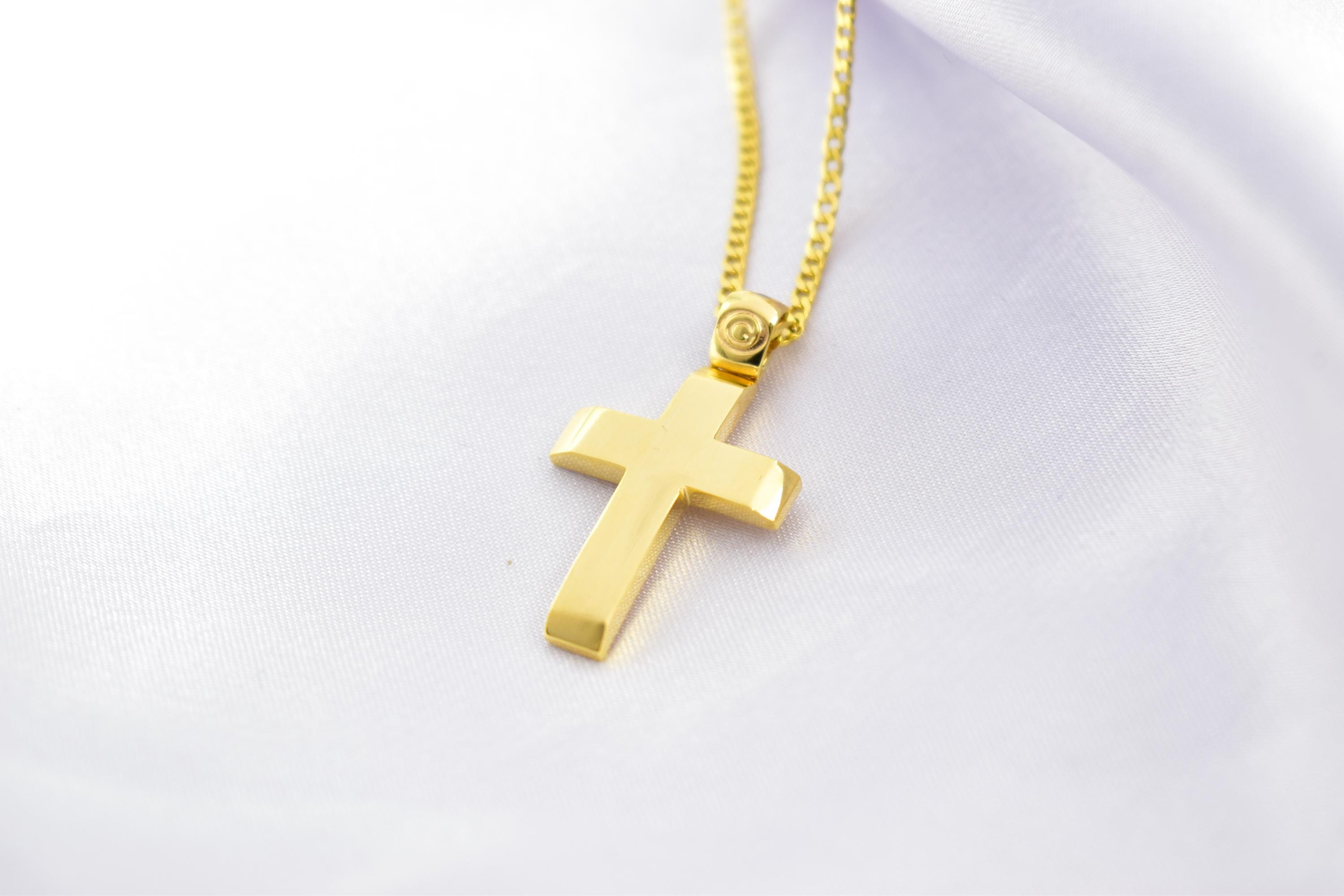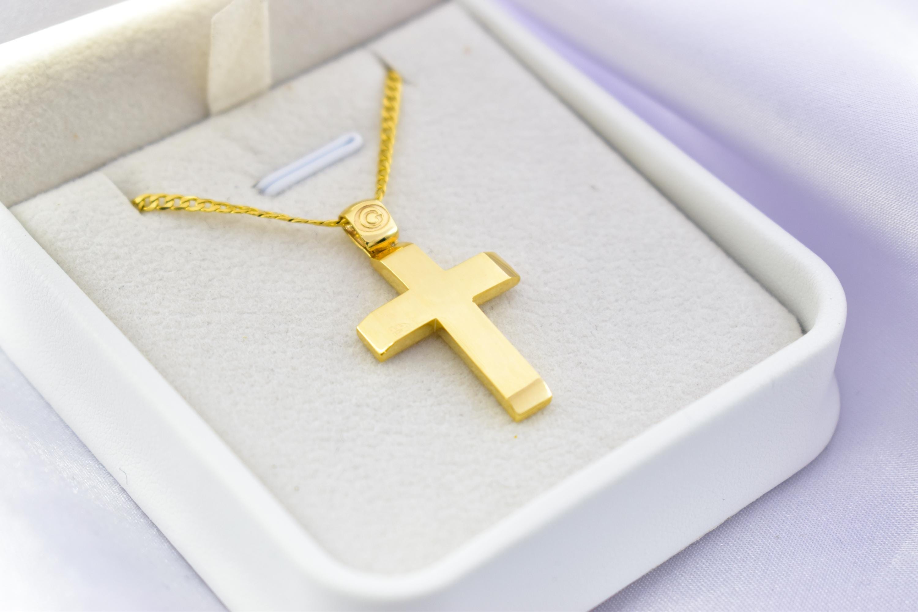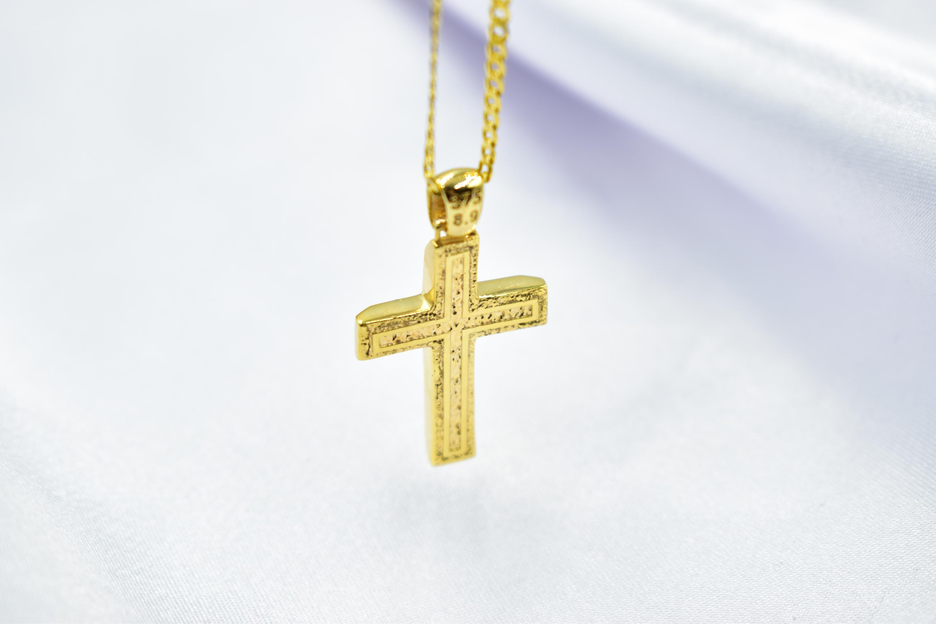 This unique two-tone solid gold cross necklace combines tradition with distinctive design. The cross pendant is crafted in solid 9K yellow gold, while the chain is made of 14K yellow gold – offering both durability and elegance.