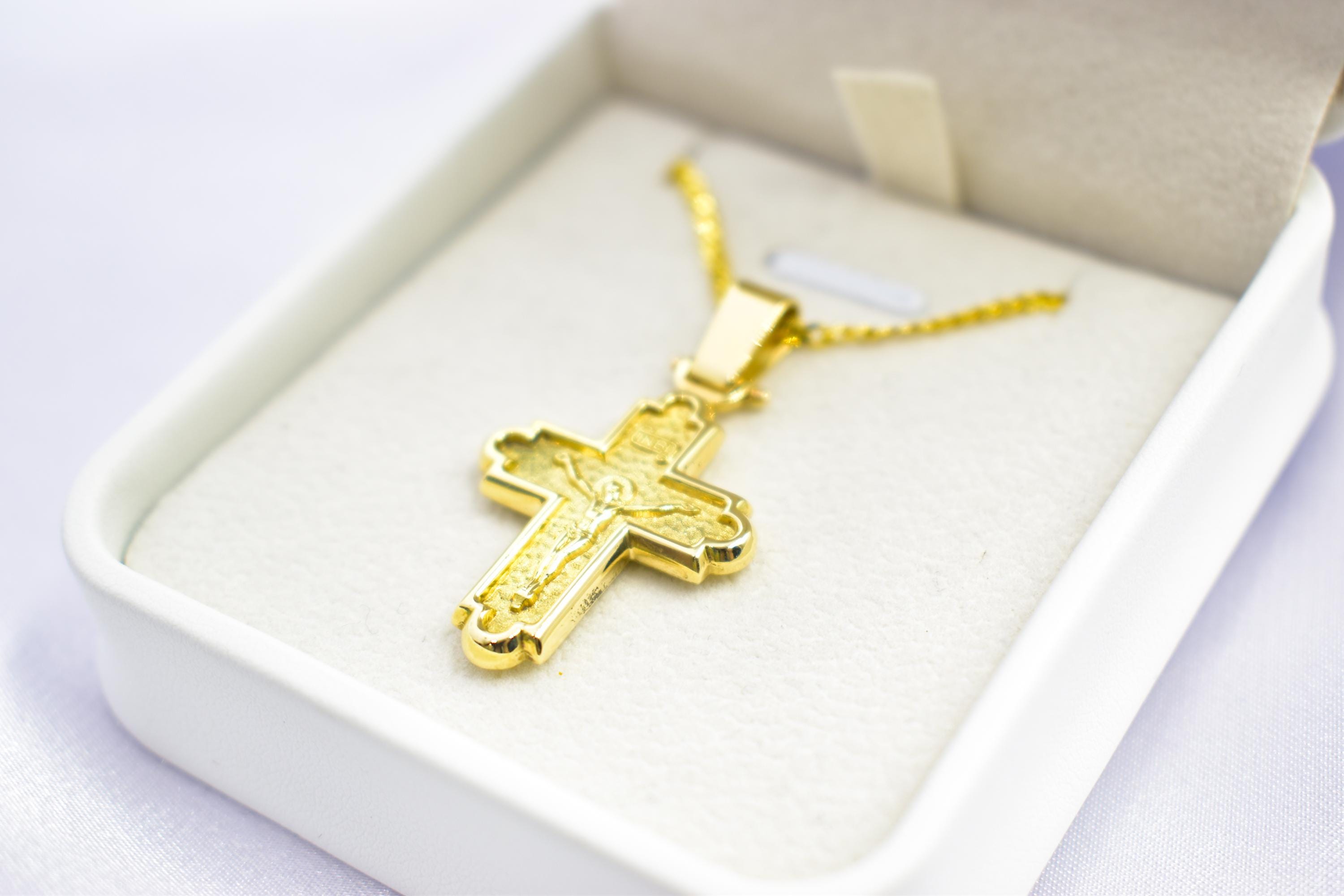 This powerful and elegant solid 14K gold crucifix pendant is a timeless piece of Orthodox Christian jewelry, featuring a detailed raised depiction of Jesus Christ on the cross on the front, and a textured, embossed finish on the reverse side.