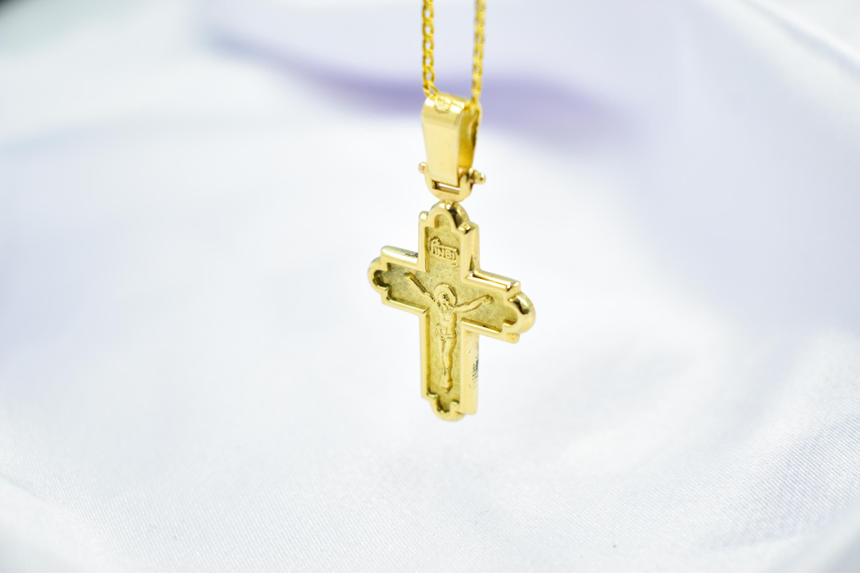 This solid gold crucifix necklace is a bold and reverent representation of devotion and craftsmanship. Its double-sided design and raised details give it both symbolic and aesthetic depth — a gift that will be cherished for a lifetime.