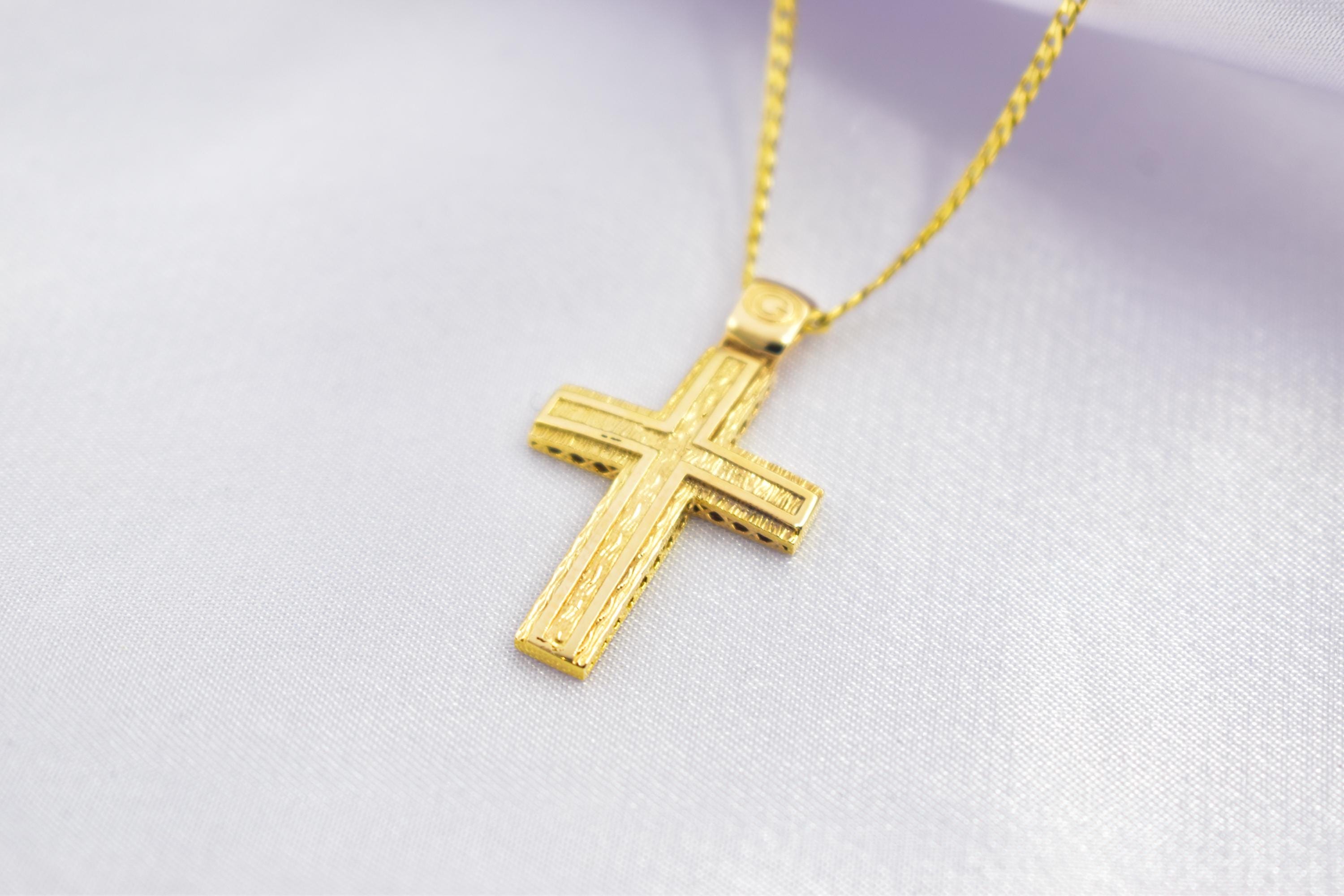Handcrafted 14K Gold Cross Pendant with Textured Design | Elegant Hollow Back Crucifix | Orthodox Christian Jewellery | Baptism Gift | Men’s & Women’s Chain Included or Optional