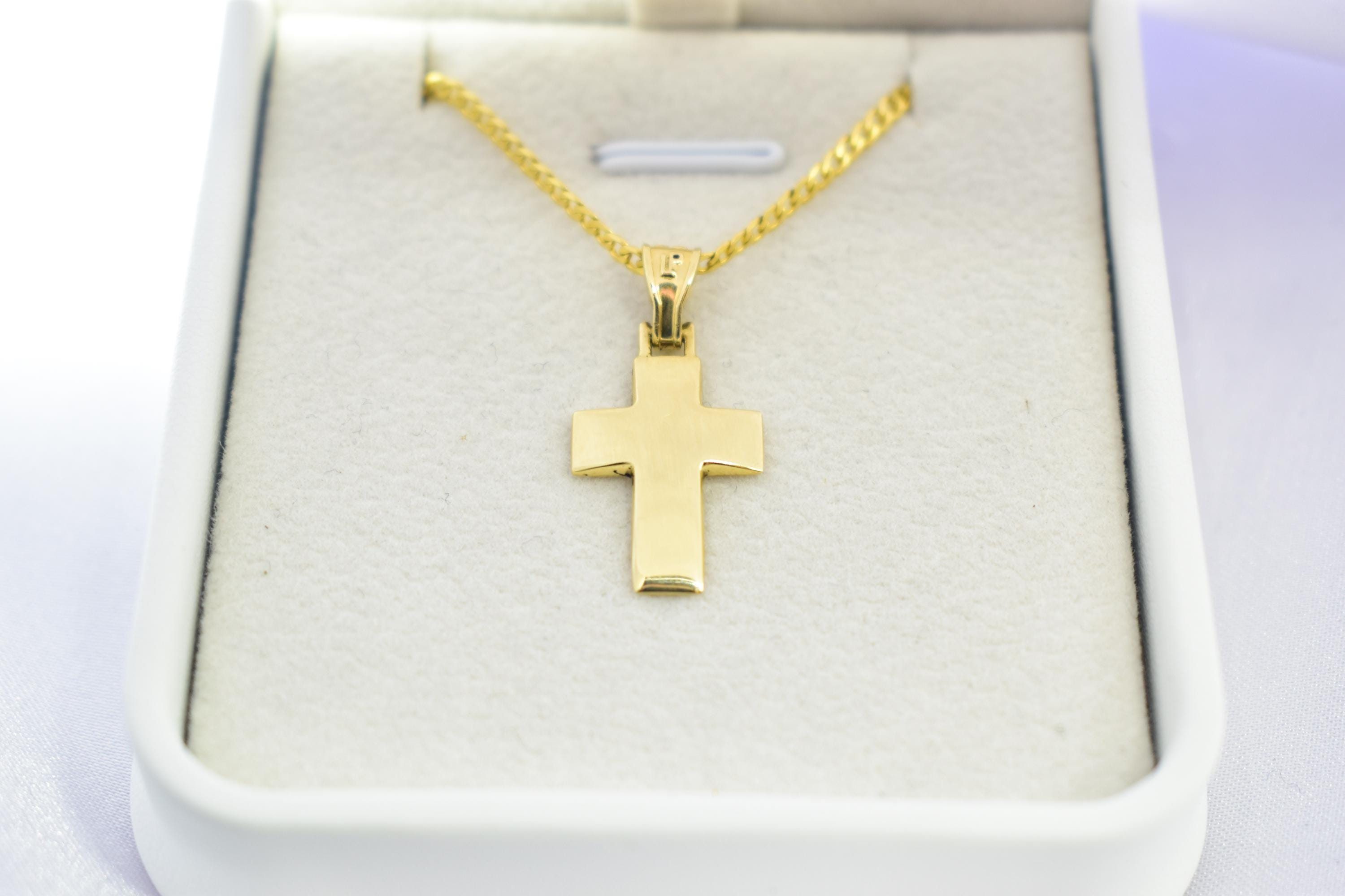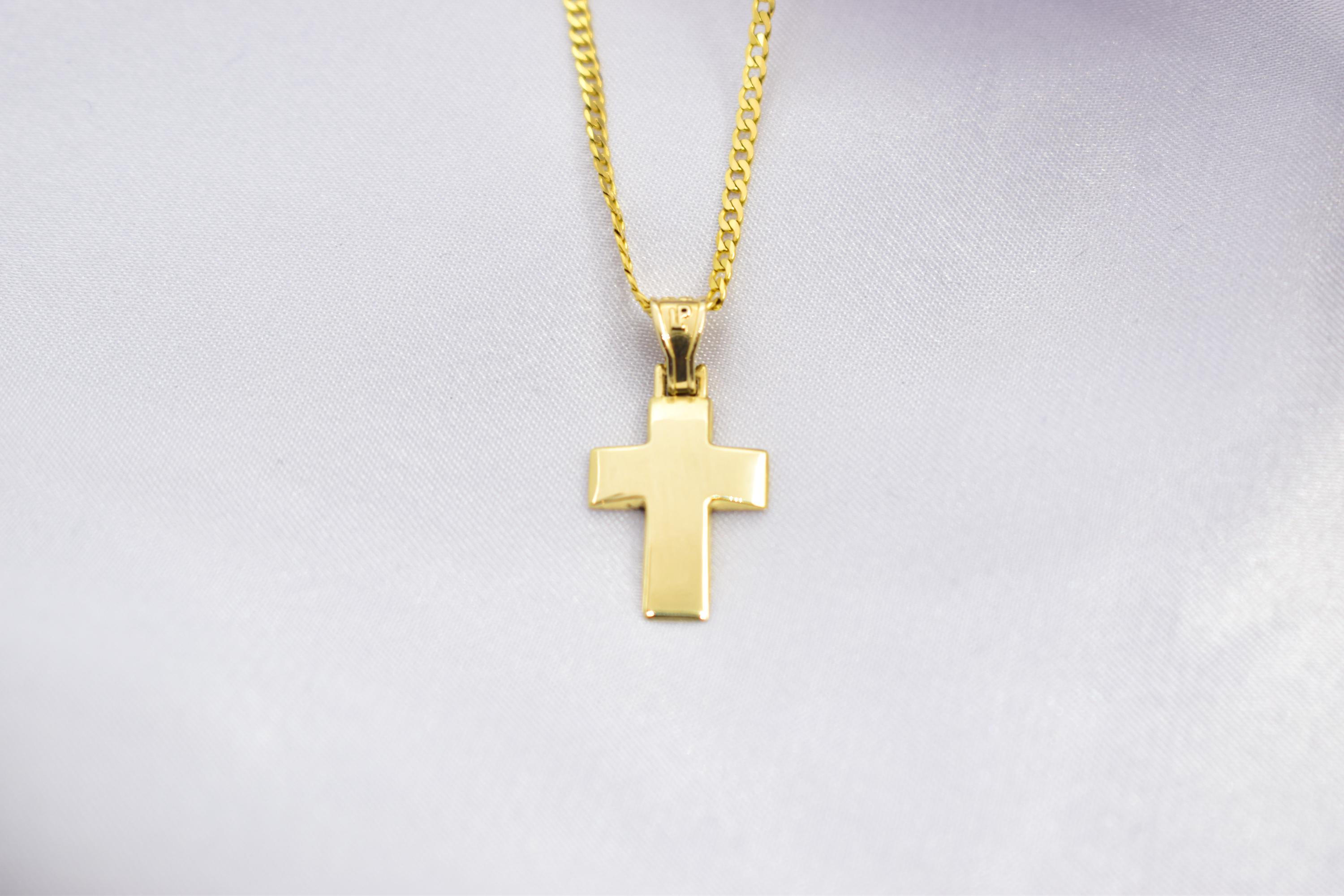 Its smooth, rounded edges and classic proportions make it ideal for everyday wear, while the brilliant shine of polished gold gives it a luxurious touch. Whether worn alone or paired with a matching 14K gold chain, this cross stands out for its simplicity, elegance, and spiritual symbolism.