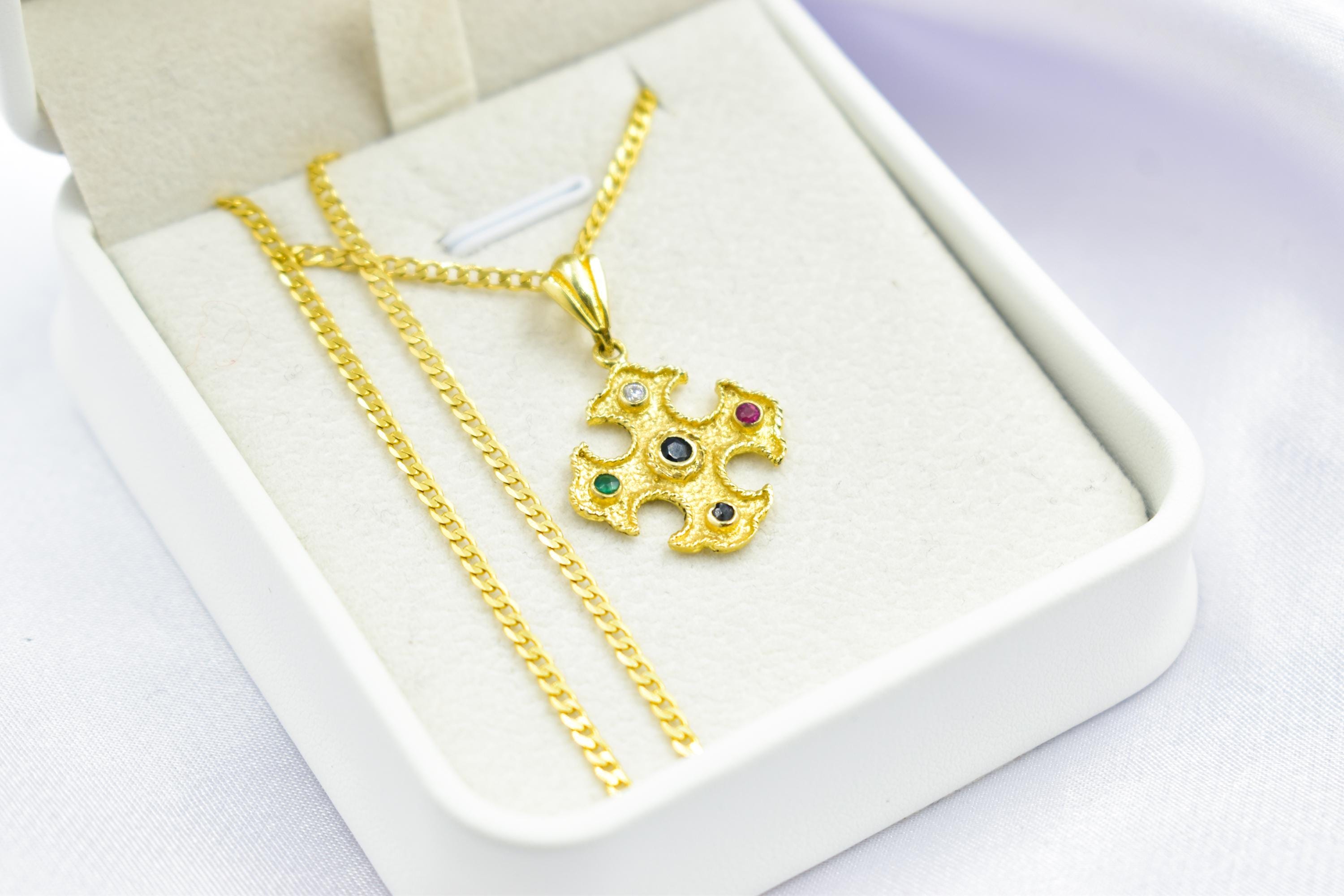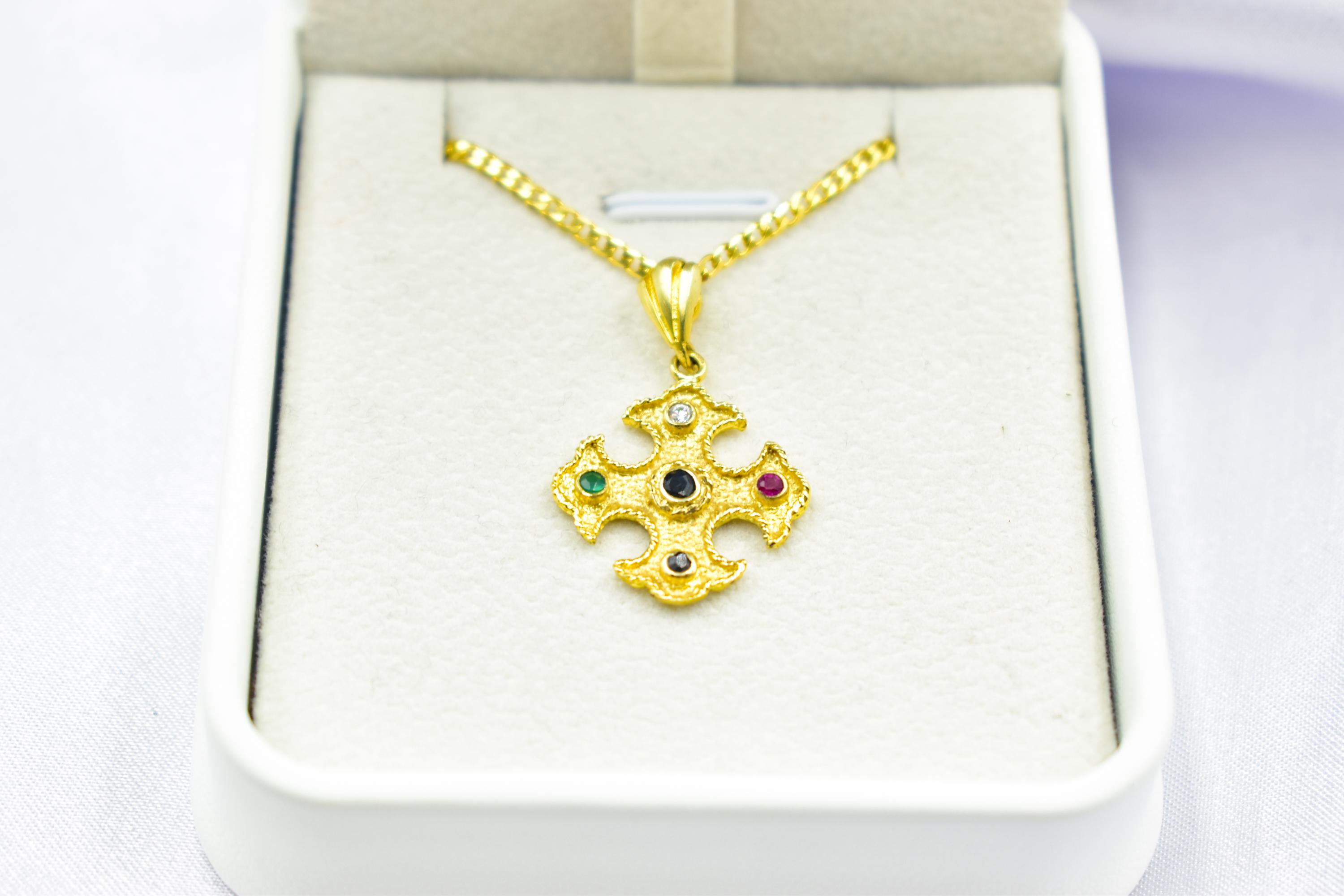 Byzantine Style 14K Gold Cross Pendant with Colorful Zircon Stones | Handcrafted Christian Necklace | Unisex Gold Crucifix with Optional Chain